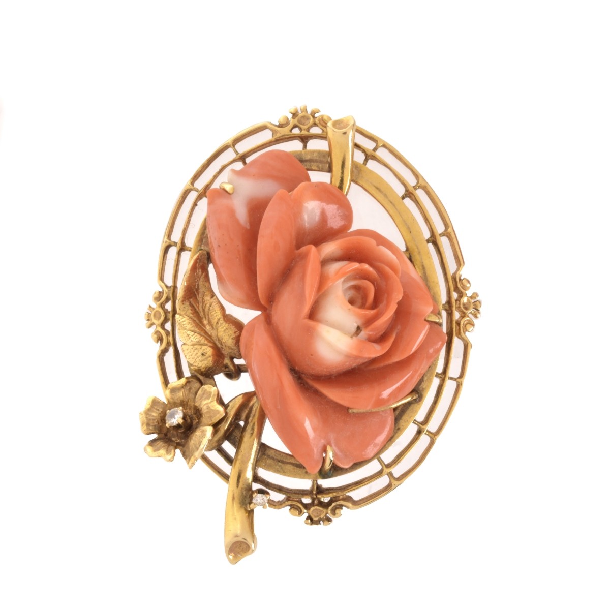 Vintage Carved Coral and 14 Carat Yellow Gold Flower Pendant / Brooch and Pendant Cameo Earrings. The pendant / brooch accented with a small round brilliant cut diamond. Stamped 14K. Brooch measures 2-1/4" H, 1-5/8" W. Approx. total weight: 33.44 grams. Condition: Overall very good vintage condition. Old repair to one earring back. Estimate: $500.00 - $1000.00 Domestic Shipping: $32.00