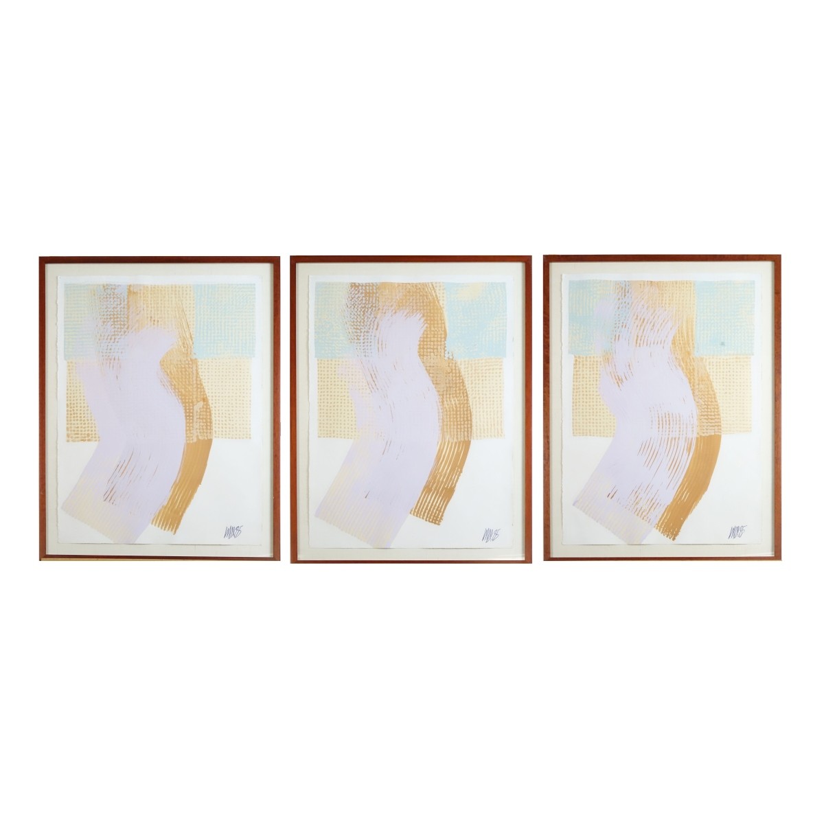 Lot of Three Mixed Media Artworks on Paper "Abstract Compositions" Each Signed and Dated 1985 Lower Right. Sheet size 30" x 22-1/2", frame measures 34-1/4" x 26-1/4". Condition: Good condition. Estimate: $100.00 - $200.00 Domestic Shipping: Third party