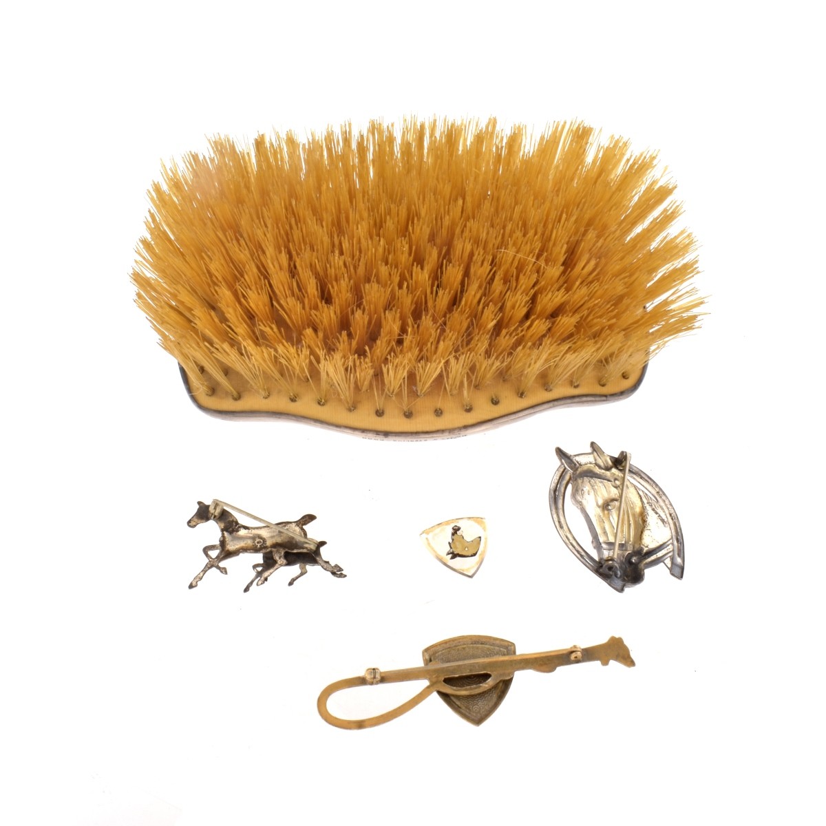 Horse Related Collectibles. To include sterling silver brush, two sterling silver pins and a gold filled and glass pin. Brush and two pins stamped sterling. Brush measure 4-5/8" x 3-1/8"; largest horse head pin measures 1-1/2" x 1-1/4". Approx. silver weight (with brush): 117.67 grams. Condition: Antique pre-owned condition. Gold filled pin needs glass reattached. Need polishing. Estimate: $100.00 - $150.00 Domestic Shipping: $40.00