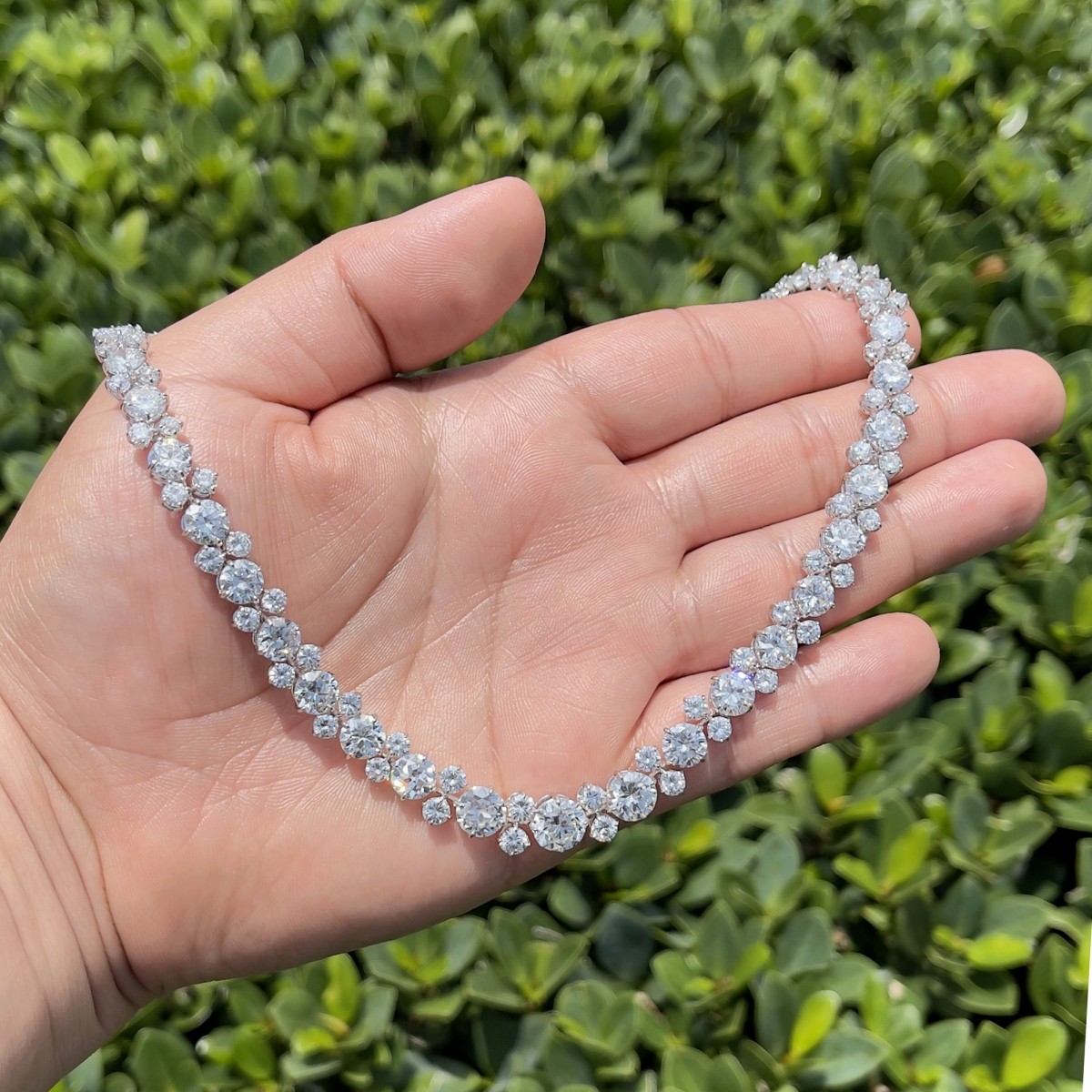 Very Fine Approx. 46.34 Carat TW One Hundred Thirty One Round Brilliant Cut Diamond and Platinum Necklace. Diamonds E-G color, VS1-SI1 clarity. Largest diamond approx. 2.50 carat, measures 8.6 x 5.4mm. Necklace measures 16" L, 3/8" W. Approx. weight: 49.90 grams. Condition: Very good condition. For additional information and/or WhatsApp video please contact our resident GIA Graduate Gemologist, Russ Kodner at 954.650.5030 Estimate: $200,000.00 - $250,000.00 Domestic Shipping: $36.00