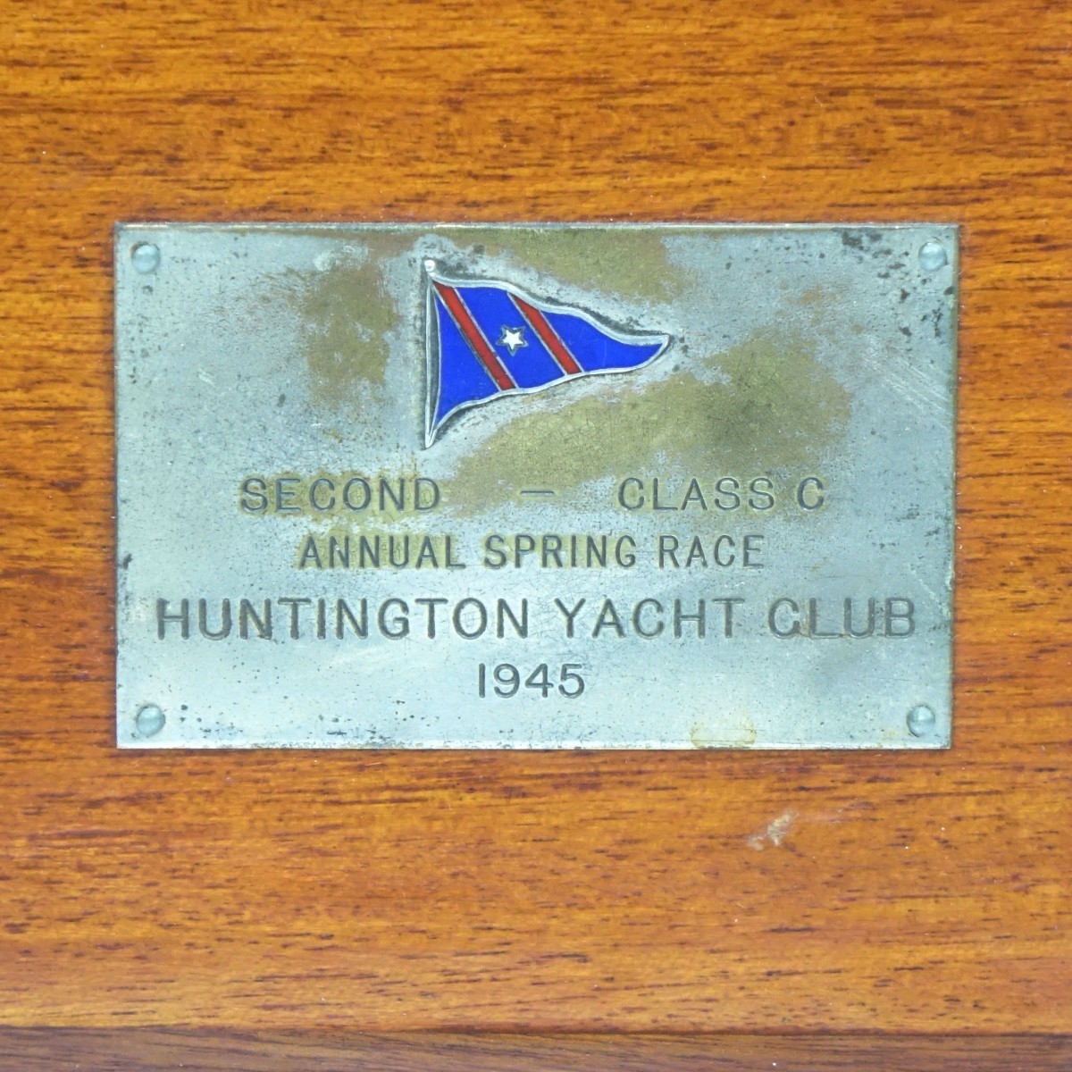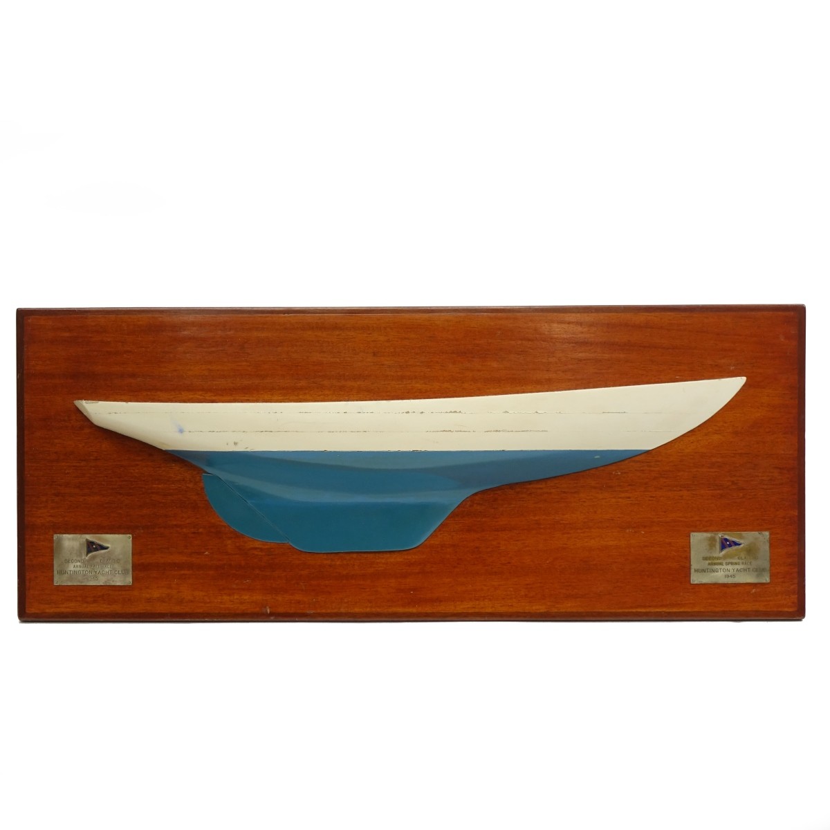 Vintage Half Hull Ship's Model Wall Hanging Plaque of the Second Class C Annual Spring Race Huntington Yatch Club. Tags affixed to the frame. Measures 14" x 35". Condition: Surface wear to the hull otherwise good condition. , Estimate: $100.00 - $300.00 Domestic Shipping: Third party