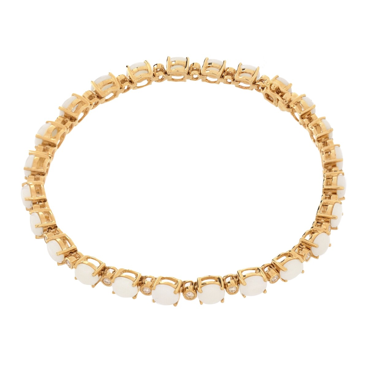 5.53 Carat TW Twenty Four Oval Cabochon Opal, .35 Carat TW Twenty Four Round Brilliant Cut Diamond and 14 Karat Yellow Gold Bracelet. Opals with good play of multi colors. Diamonds F-G color, VS1-VS2 clarity. Stamped 14K. Measures 7-1/4" L, 1/8" W. Approx. weight: 9.94 grams. Condition: Very good condition. Estimate: $800.00 - $1200.00 Domestic Shipping: $30.00
