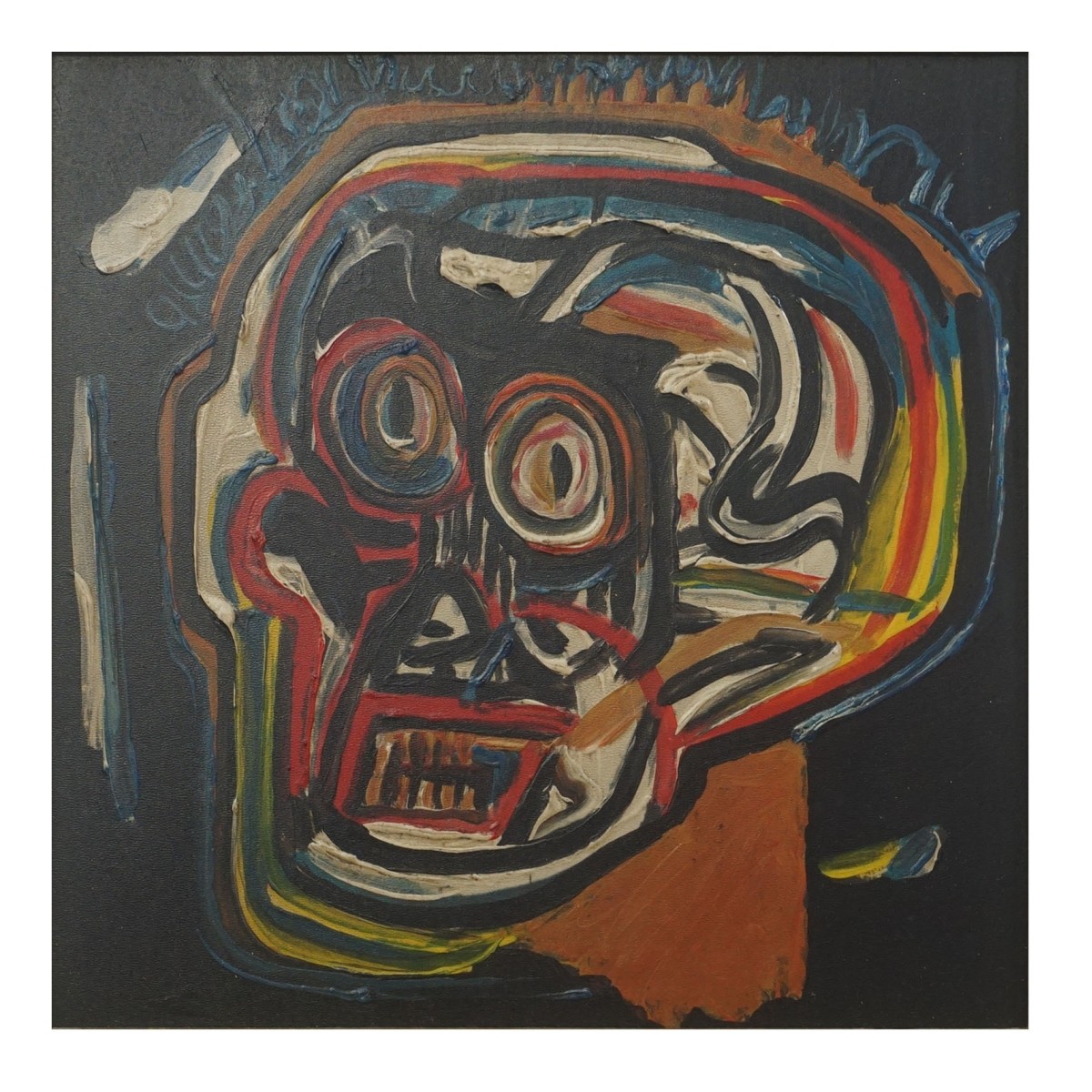 After: Jean-Michel Basquiat, American (1960 - 1988) Oil on Board "Abstract Skull" Unmarked. Sight measures 11-1/8" squared, frame measures 13-3/4" squared. Condition: Good condition. Estimate: $50.00 - $200.00 Domestic Shipping: $78.00