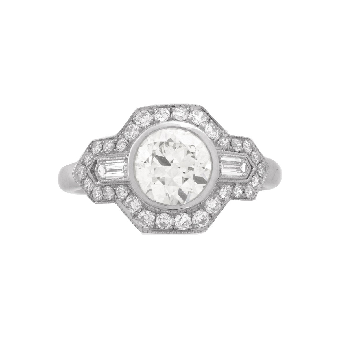 Art Deco style Diamond and Platinum Ring. Set in the center with a 1.10 carat old European cut diamond, I color, VS1 clarity. Accented with .44 carat TW round brilliant cut diamonds, E-F color, VS1-VS2 clarity. Stamped Plat. Ring size 6-1/4. Approx. weight: 4.87 grams. Condition: Very good condition. Estimate: $4000.00 - $6000.00 Domestic Shipping: $28.00