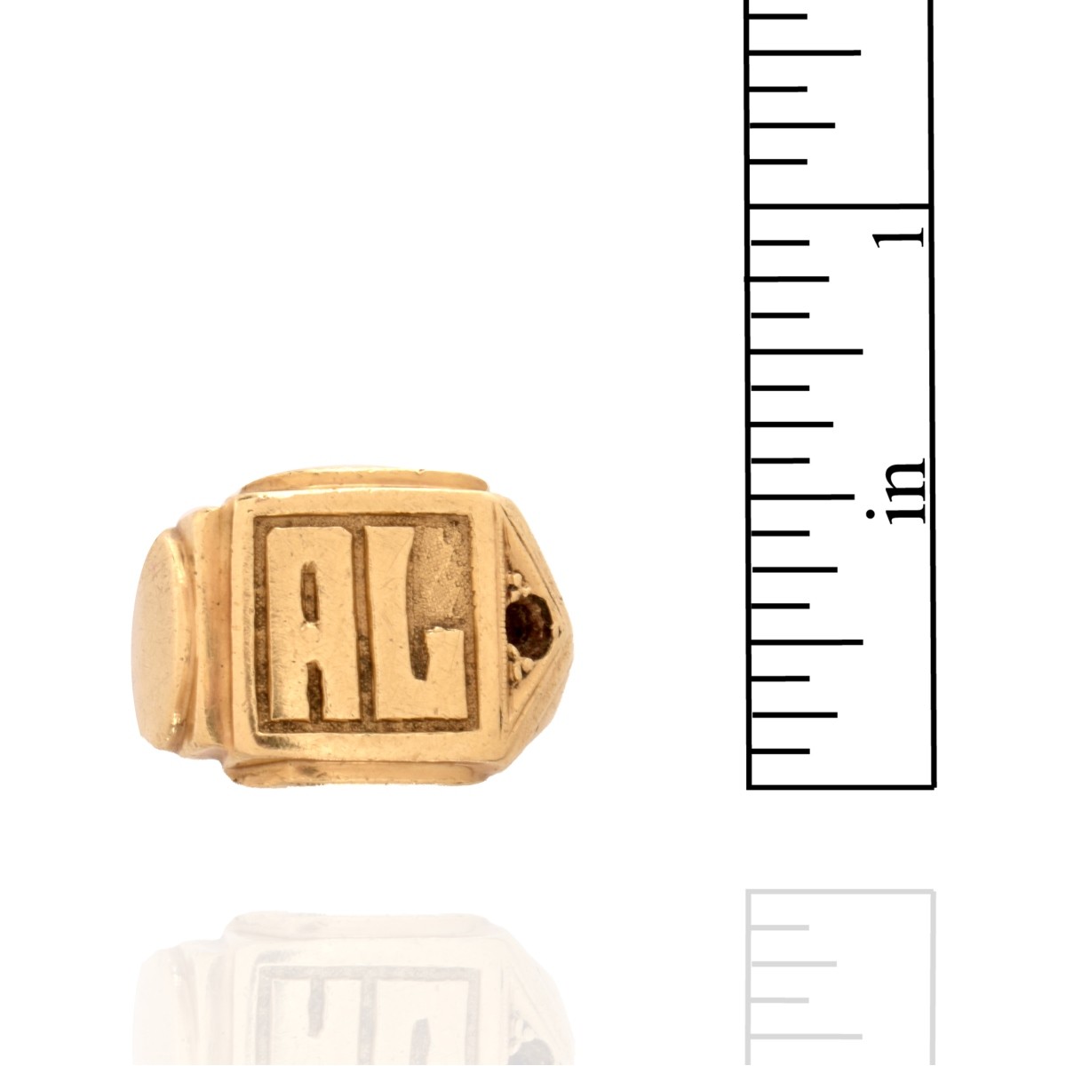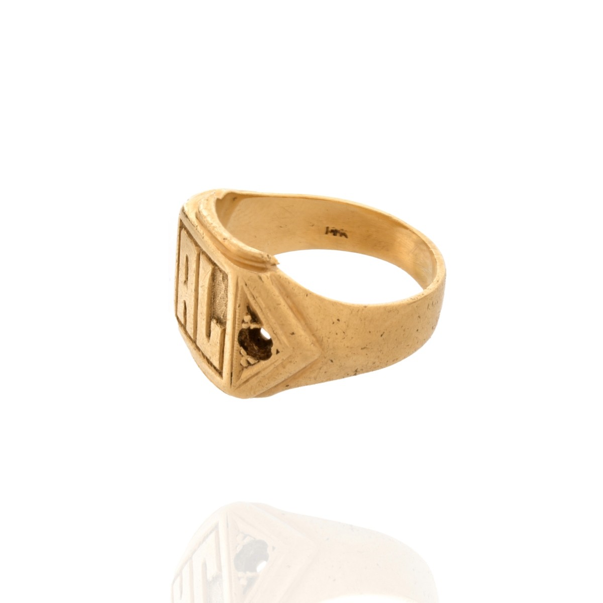 Man's Vintage 14 Karat Yellow Gold Ring with Initials AL. Ring size 7. Approx. weight: 9.93 grams. Condition: Good pre-owned condition. Light surface wear from normal use. Missing what was probably a small round cut diamond. Estimate: $200.00 - $400.00 Domestic Shipping: $28.00