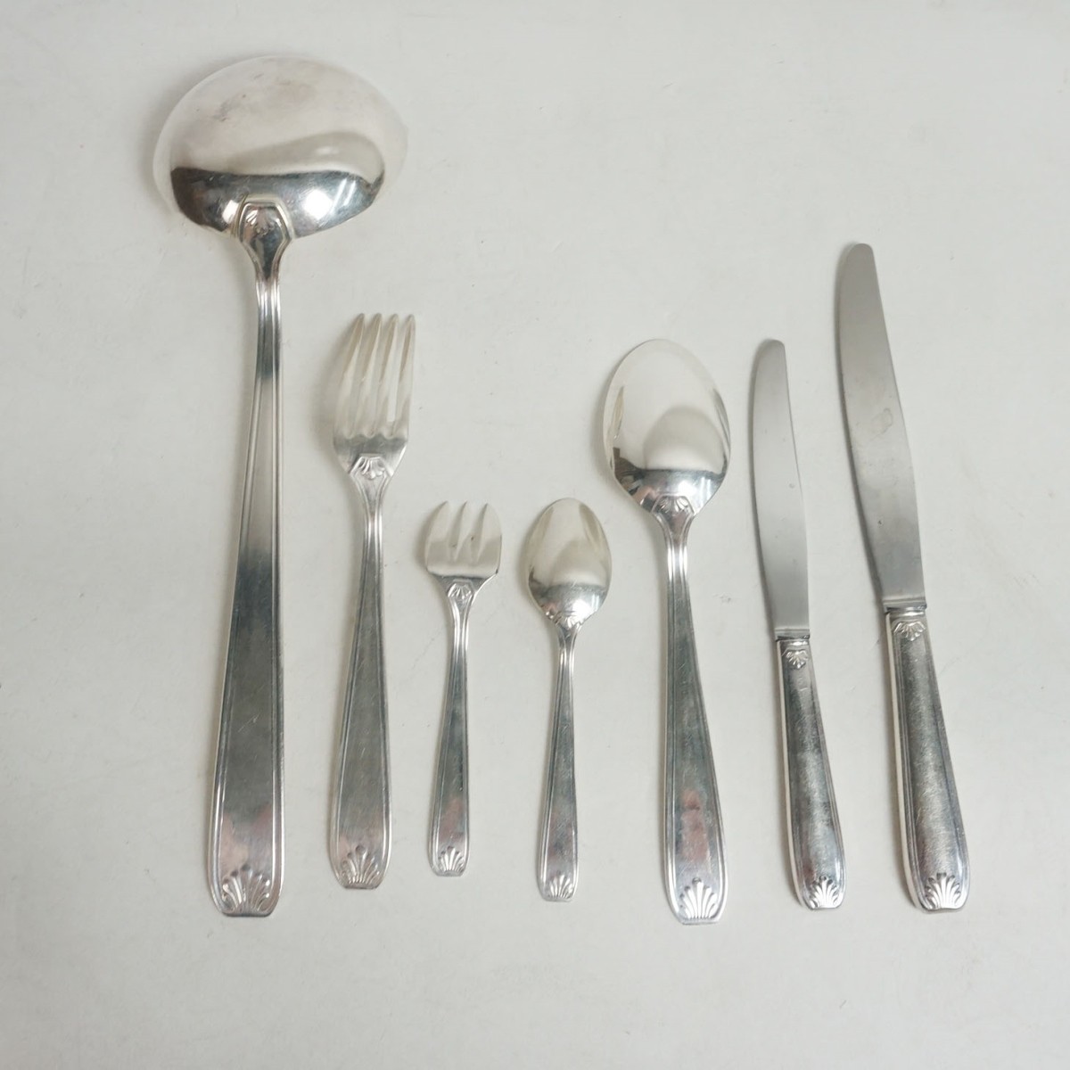 Eighty Three (83) Piece Christofle Shell Pattern Silverplate Flatware. Includes: (11) knives measuring 9-3/8", (12) knives measuring 7-7/8", (12) forks measuring 8", (12) spoons measuring 8-1/8", (24) teaspoons, (12) seafood / cocktail forks, and large serving spoon measuring 12-1/4". Marked on the bowl. Box is for display purpose only. Condition: Good condition. Estimate: $800.00 - $1200.00 Domestic Shipping: $115.00