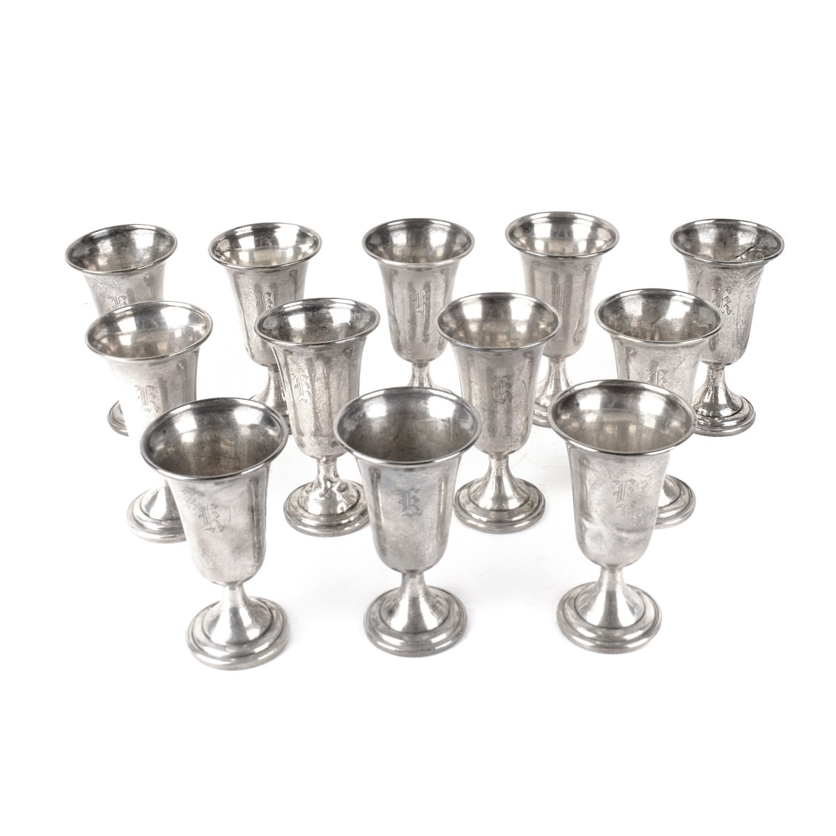 Lot of Twelve (12) Newburyport Silver Co Weighted Sterling Silver Kiddush Cups. Stamped. Monogrammed. Measures 3-1/4" x 1-3/4". Condition: Needs cleaning. Some has some dings to the surface. One has some wear to the stem. Estimate: $50.00 - $100.00 Domestic Shipping: $62.00