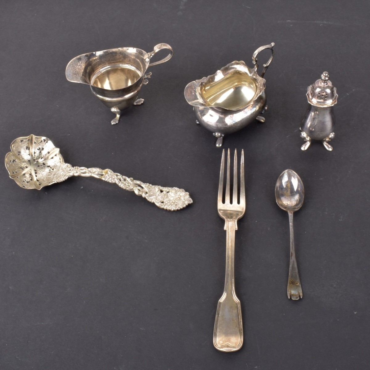 Grouping of Six (6) Vintage Assorted English Silver Tableware. Includes: two creamers, Mappin & Webb shaker, fork, demitasse spoon, and a ornate pierced serving spoon. All appropriately hallmarked except for the shaker. Pierced spoon measures 6-1/2". Tallest creamer measures 2-1/2" x 3-7/8". Total approx. weight: 8.8 troy ounces. Condition: Needs cleaning otherwise good condition. Estimate: $50.00 - $150.00 Domestic Shipping: $66.00