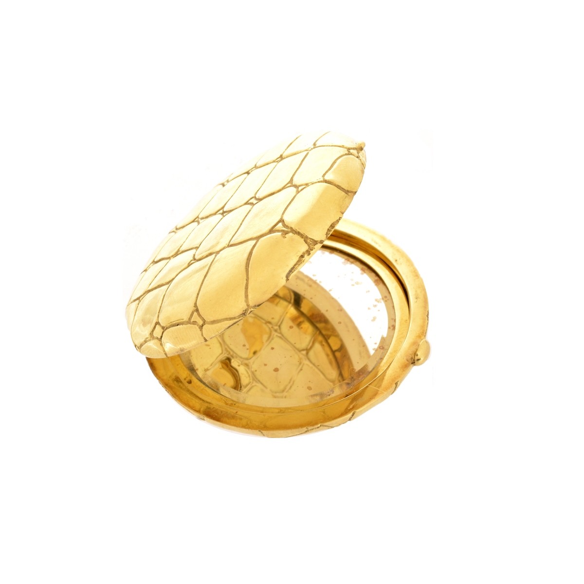Vintage Italian for Tiffany 18 Karat Yellow Gold Compact with Mirror. Stamped 18K Italy Tiffany. Measures 2" diameter. Approx. gross weight: 55.42 grams. Condition: Very good vintage condition. Foxing to mirror, small flake to edge of mirror. Light surface wear to gold. Estimate: $4000.00 - $6000.00 Domestic Shipping: $32.00