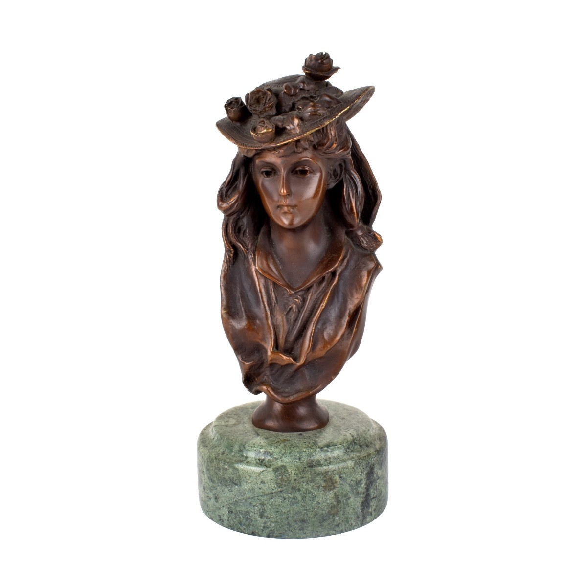 20th Century Art Nouveau Bronze Bust Mounted on Marble Base. Unsigned. Bust measures 8-1/2" x 3-1/2" x 3-1/2". Overall height: 10-1/2". Condition: Good condition. Estimate: $50.00 - $150.00 Domestic Shipping: $72.00