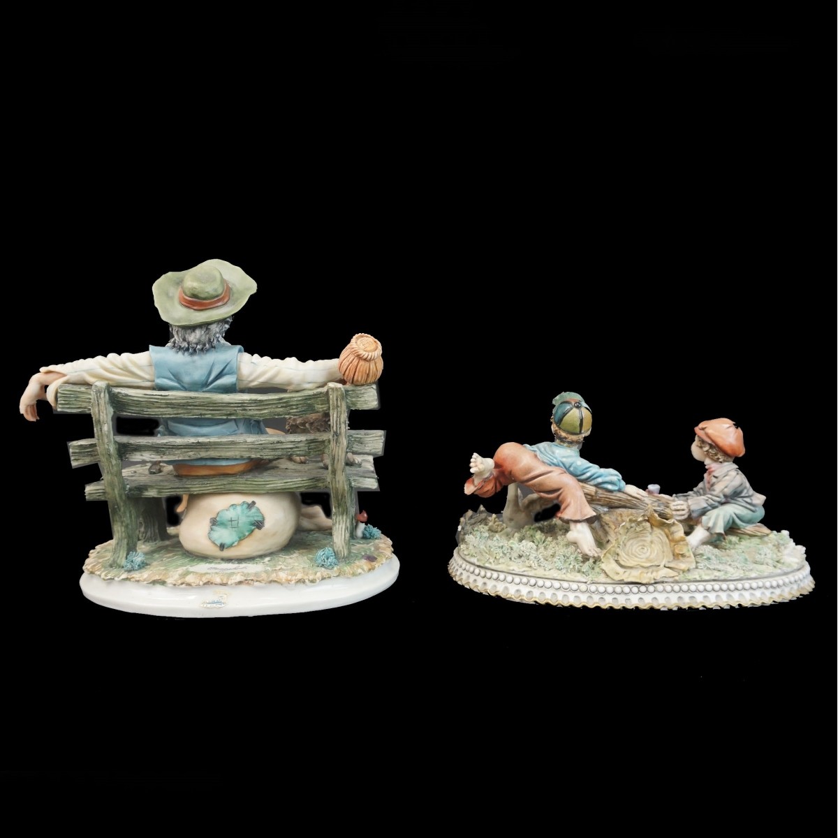 Grouping of Two (2) Vintage Capodimonte Porcelain Figures. Signed and marked made in Italy on the base. Largest measures 4-3/4" x 8" x 4-1/2". Other figure measures 4-1/2" x 8-1/2" x 5". Condition: Each having chips to the surface otherwise good condition. Estimate: $50.00 - $100.00 Domestic Shipping: Third party