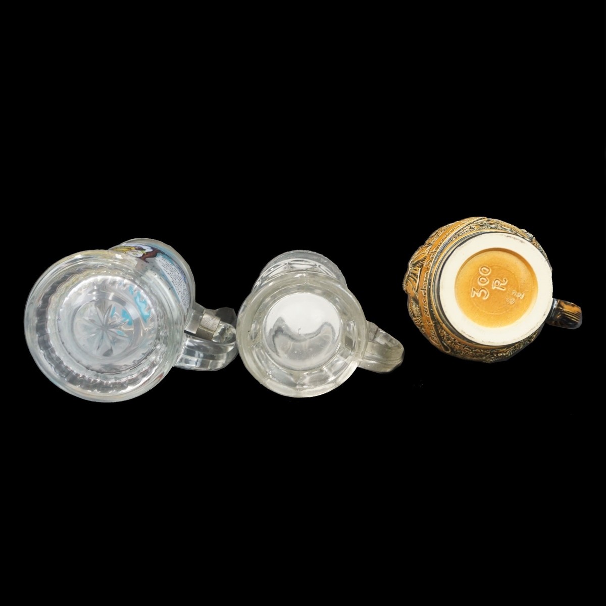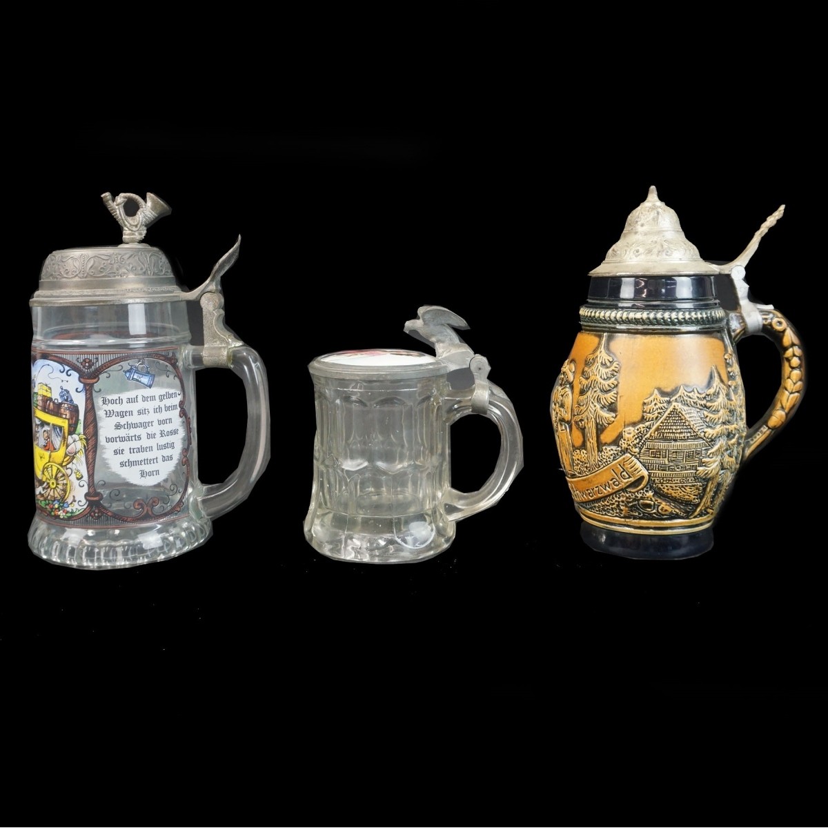 Lot of Three (3) Vintage German Steins. Two are made of glass. Porcelain stein is signed on the base. Tallest measures 8-1/4" x 5-1/4" x 4" (w/ handle). Shortest measures 5-1/2" x 5" x 3-3/8" (w/handle). Condition: Good condition. Estimate: $50.00 - $100.00 Domestic Shipping: $72.00