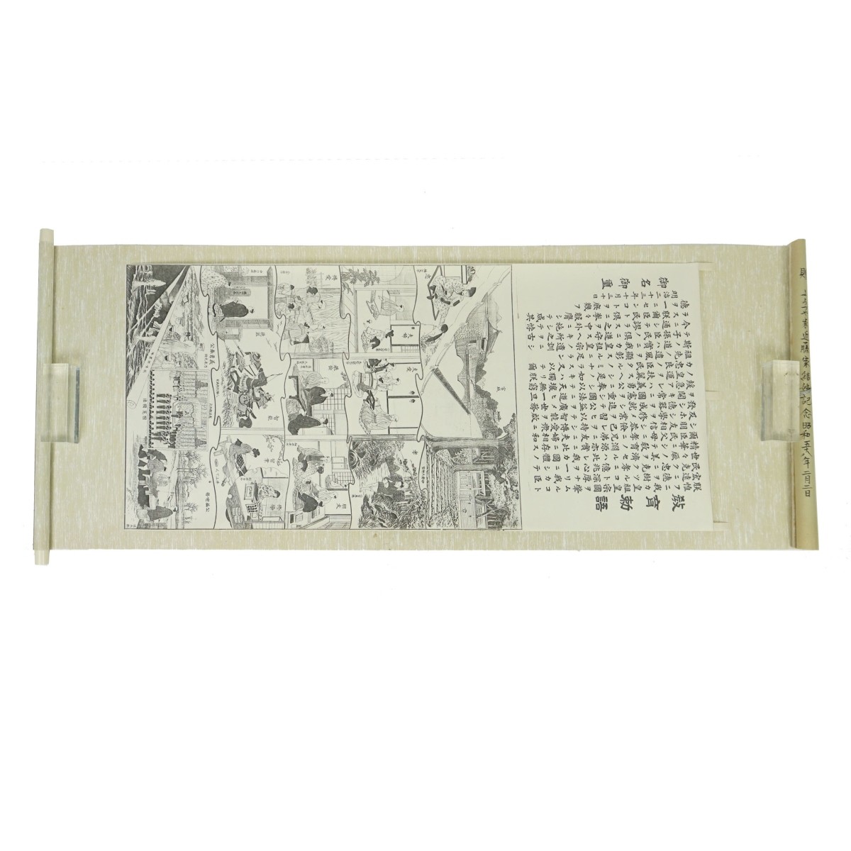 Vintage Japanese Woodblock Printed Scroll with Bone Style Handles. Poem and illustration. Calligraphy work on the exterior of the scroll. Scroll measures 62-1/2" x 23-1/2". Condition: Good condition. Estimate: $50.00 - $100.00 Domestic Shipping: $48.00