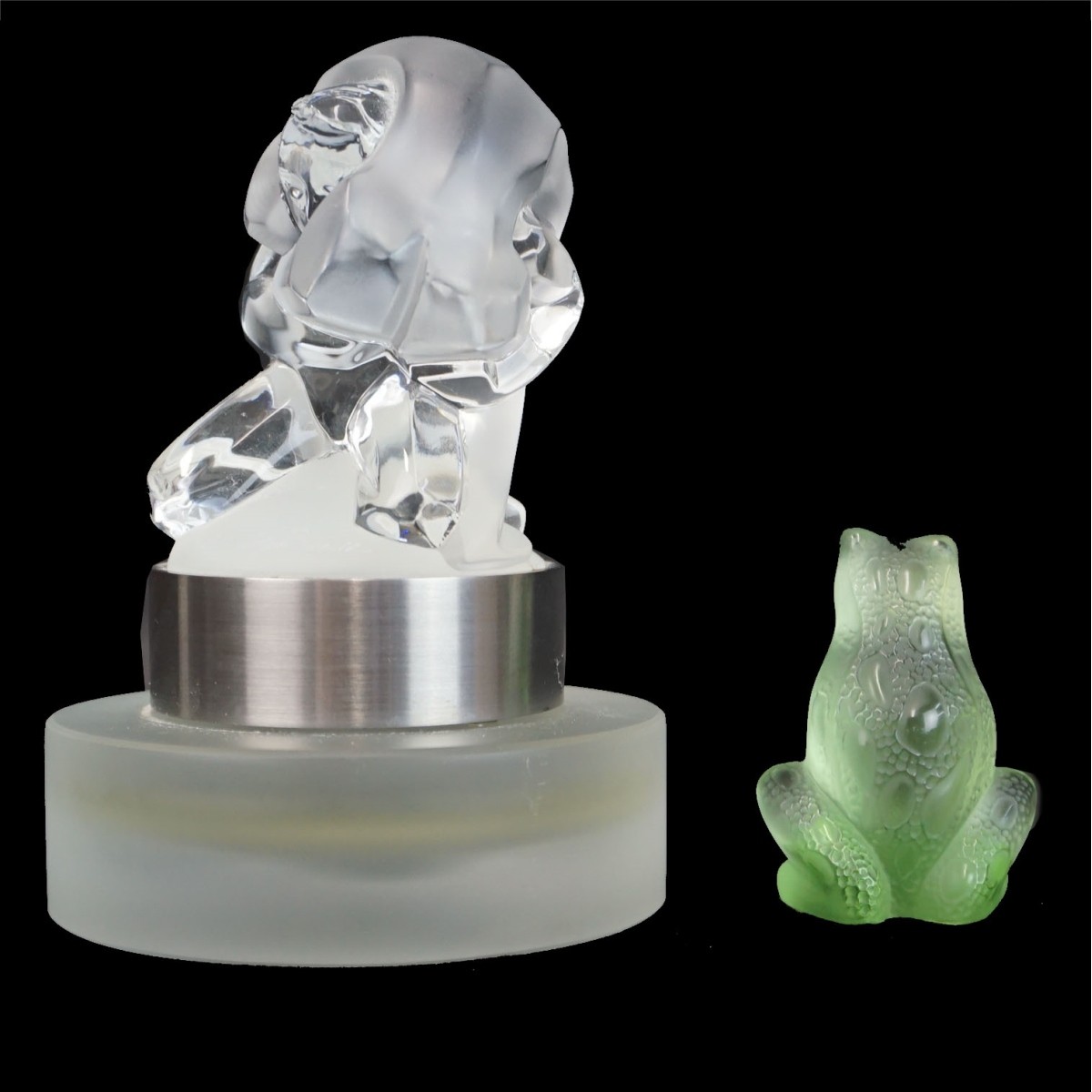 Grouping of Two (2) Lalique Crystal Tableware. Includes "Les Lutteurs" Factice Bottle together with green frog . Each signed Lalique France. Factice measures 5-1/4" x 3-1/2". Frog measures 2-1/8" x 1-1/2". Condition: Good condition. Estimate: $100.00 - $200.00 Domestic Shipping: $58.00