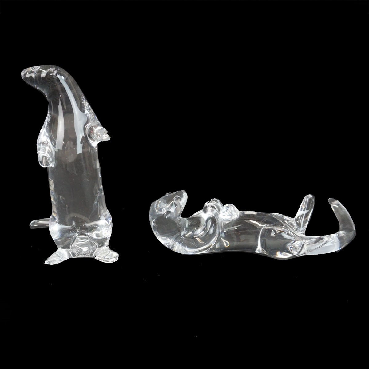 Lot of Two (2) Baccarat Crystal Otter Figurines. Each signed on the base. Sticker label still attached. Tallest measures 5-1/2" x 2" x 4-1/4". Reclining figurine measures 2" x 6-1/2" x 3-1/2". Condition: Good condition. Estimate: $50.00 - $150.00 Domestic Shipping: $55.00