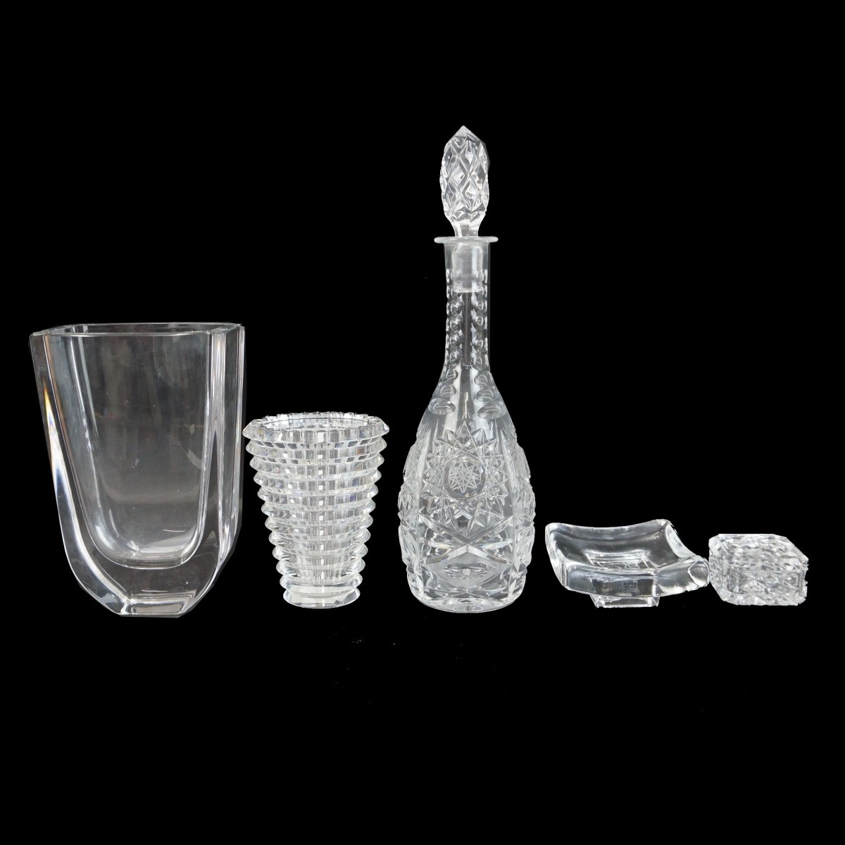 Grouping of Five (5) Vintage Assorted Glass Tableware. Includes a Orrefors vase, Kosta Boda dish with etched presentation name on the top, Waterford trinket box, unsigned vase, and a decanter. Orrefors vase measures 8-5/8" x 5-5/8" x 4-3/8". Decanter measures 14-1/2" x 4". Condition: Good condition. Estimate: $50.00 - $150.00 Domestic Shipping: Third party