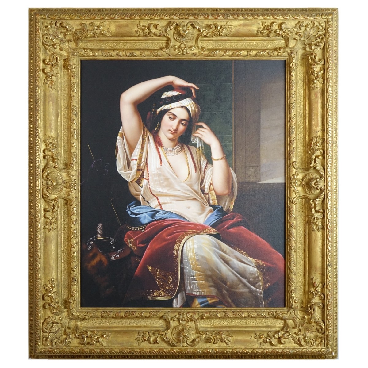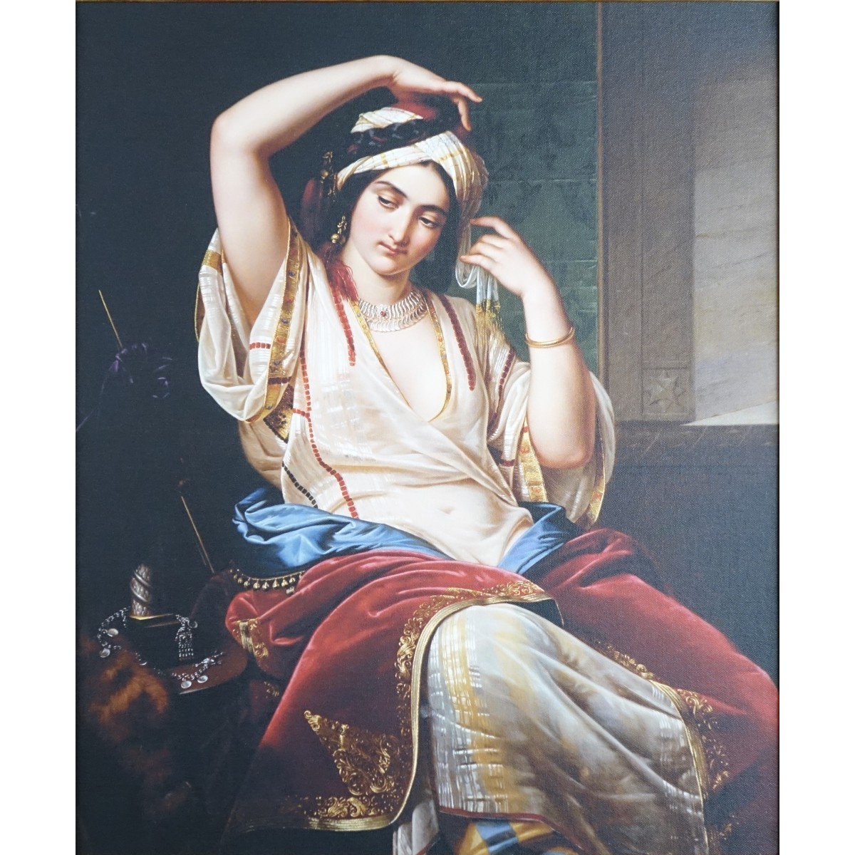 Orientalist Screenprint on Board "Portrait of a Young Beauty" Unmarked. Measures 24" H x 20" W, frame measures 34" H x 29-1/2" W. Provenance: The estate of Leon Amar, Palm Beach, Florida. Condition: Good condition Estimate: $100.00 - $300.00 Domestic Shipping: Third party