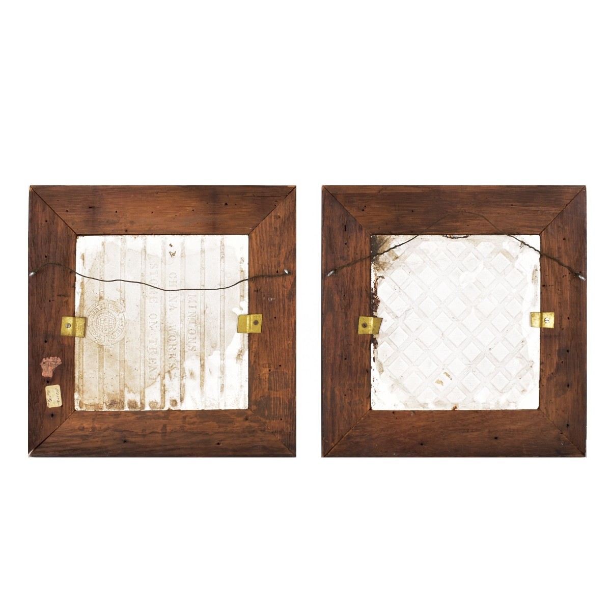 Pair of Antique Faience Stroke on Trent Porcelain Plaques. Signed en verso. Measures 6" squared. Frames measure 9-1/2" square. Condition: Crazing otherwise good condition. Estimate: $50.00 - $150.00 Domestic Shipping: $78.00