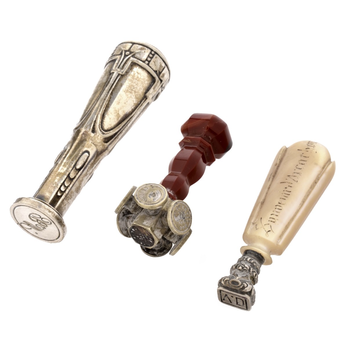 Three Antique Wax Seal Stamps. Including multiple stamp with carved carnelian handle, single stamp with carved mother of pearl handle and single stamp with Alpacca ("nickel silver") handle. Largest (Alpacca) measures 3-5/8" H, 1" W; smallest (with carnelian) measures 2-3/8" H, 1" W. Condition: Very good antique condition. Small chips to mother of pearl. Estimate: $50.00 - $200.00 Domestic Shipping: $36.00