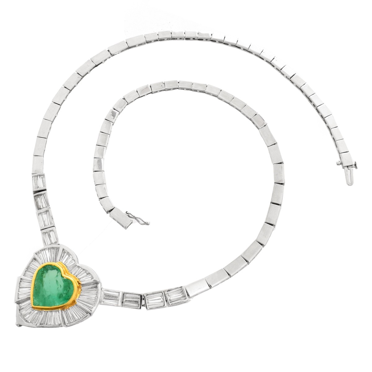15.0 Carat Heart Shape Emerald, 8.0 Carat TW Baguette Cut Diamond and 18 Karat White Gold Pendant Necklace. Emerald with vivid saturation of color, measures 13.0mm x 14.25mm. Diamonds E-F color, VS1-VS2 clarity. Pendant measures 1-1/8" H, 1-1/8" W; necklace measures 17" L. Approx. weight: 47.0 grams. Condition: Very good condition. For additional information and/or WhatsApp video please contact our resident GIA Graduate Gemologist, Russ Kodner at 954.650.5030 Estimate: $30,000.00 - $40,000.00 Domestic Shipping: $34.00