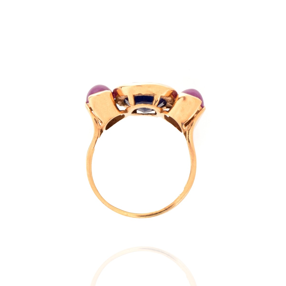 Approx. 10.0 Carat Oval Cut Sapphire, 3.50 Carat TW Two Cabochon Ruby and 14 Karat Rose Gold Ring. Sapphire and rubies with vivid color. Ring size 11. Approx. weight: 8.50 grams. Condition: Very good condition. For additional information and/or WhatsApp video please contact our resident GIA Graduate Gemologist, Russ Kodner at 954.650.5030 Estimate: $5000.00 - $7000.00 Domestic Shipping: $30.00