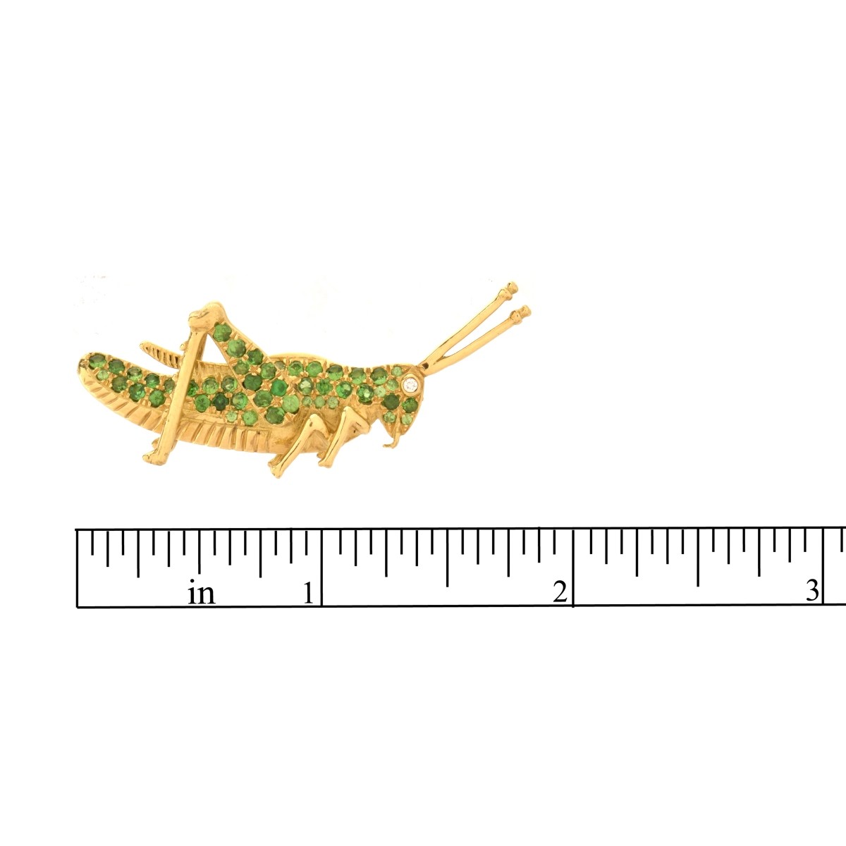 Pave Set Round Cut Tsavorite Garnet and 18 Karat Yellow Gold Grasshopper Brooch accented with Diamond Eye. Garnets with vivid color. Stamped 18K. Measures 3/4" H, 2" L. Approx. weight: 9.79 grams. Condition: Very good condition. Estimate: $1000.00 - $1500.00 Domestic Shipping: $28.00