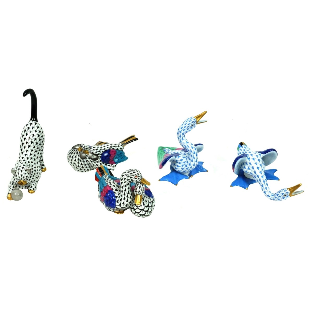 Lot of Five Herend Fishnet Porcelain Figurines. Includes swan couple, love birds, playful cat, and geese. All signed and numbered. Cat figurine measures 5-1/4" x 4-7/8" x 1-7/8". Love birds measure 2-1/8" x 2-3/4" x 4-1/4". Condition: Good condition. Estimate: $150.00 - $350.00 Domestic Shipping: $62.00