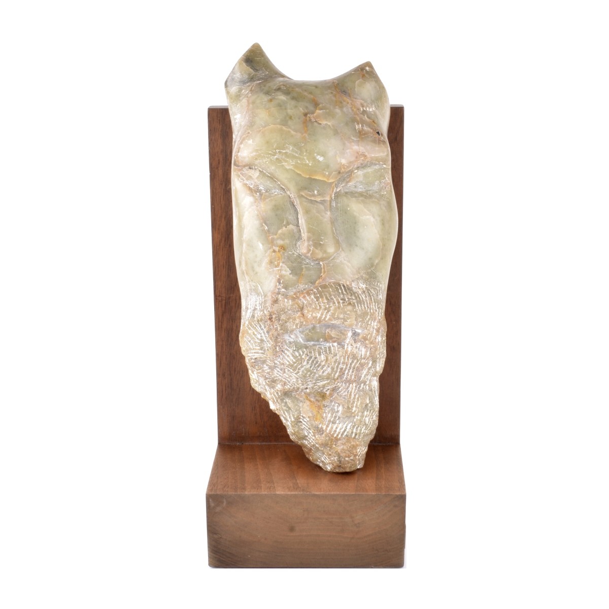 Marilyn Newman (20th Century) Carved Marble Sculpture"The Green One" Mounted on Presentation Display Stand. Tag signed affixed to the stand. Sculpture measures 13", overall measures 15-3/4". Condition: Good condition. Estimate: $200.00 - $400.00