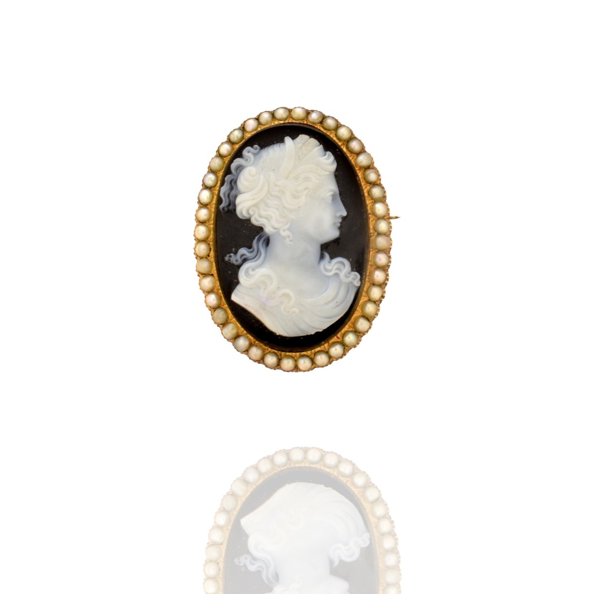 Antique Carved Hardstone, Natural Pearl and 14 Karat Yellow Gold Pendant / Brooch. Measures 1-5/8" H, 1-1/4" W. Approx. weight: 16.80 grams. Condition: Very good antique condition. Estimate: $1000.00 - $1500.00 Domestic Shipping: $30.00