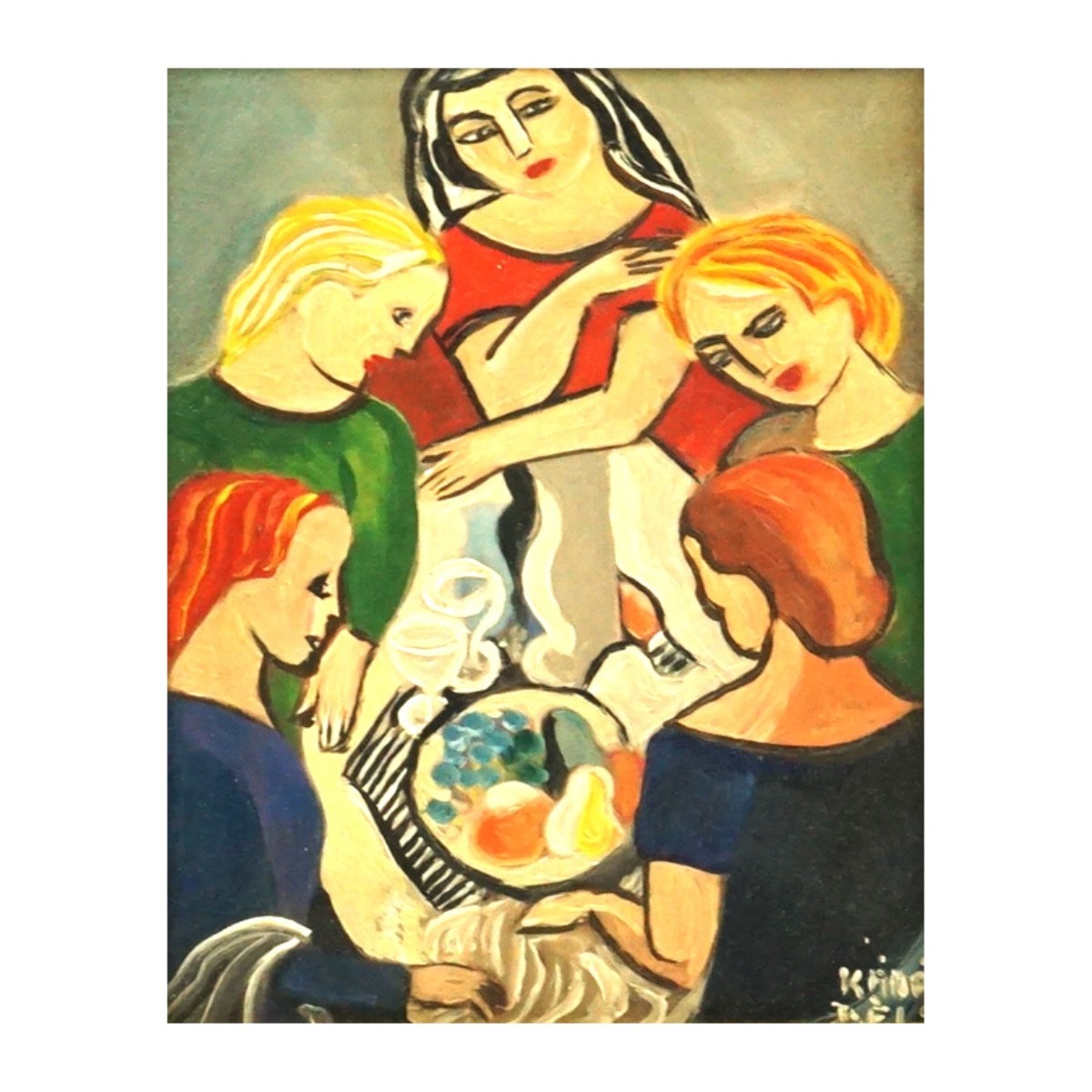 Attributed To: Bela Kadar, Hungarian (1877 - 1956) Oil on Board "Gathering at the Table" Signed Lower Right. Sight measures 10-5/8" x 8-1/2", frame measures 17" x 14-3/4". A work listed as "attributed to:" the respective artist has not been authenticated by a recognized expert on the artist in question. We offer such a work without warranty as to authenticity. Condition: Good condition. Estimate: $100.00 - $300.00 Domestic Shipping: $115.00
