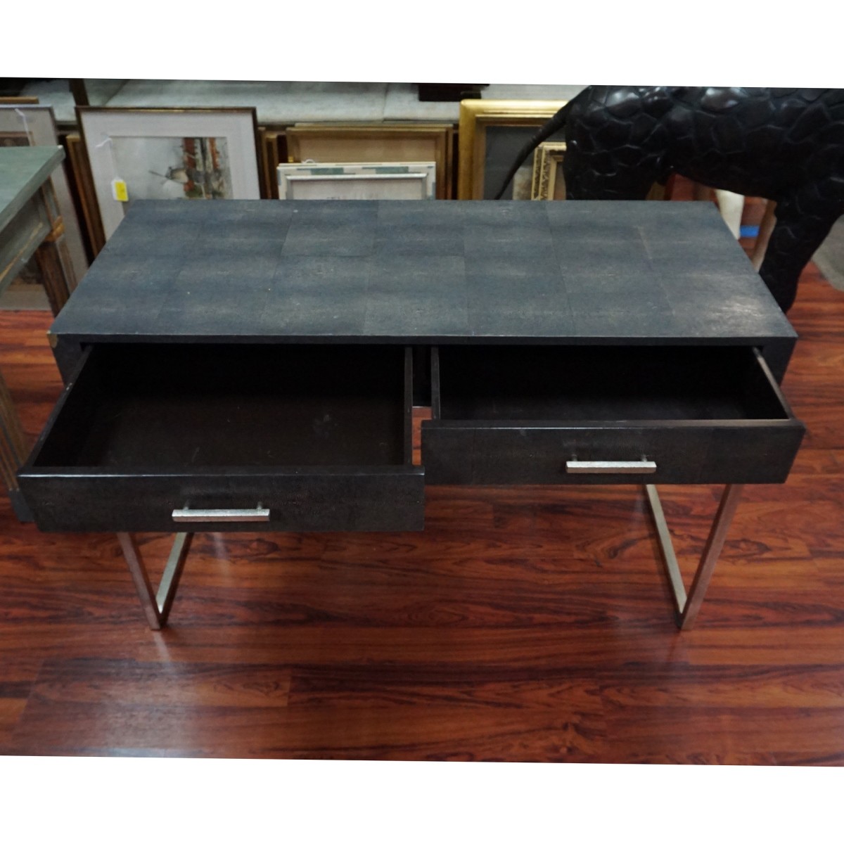 Mid Century Sarreid Style Faux Shagreen Desk. Feature two doors and stands on a metal base. Measures 30-3/4" x 47-1/4" x 19-3/4". Condition: Surface loss to one corner, rubbing, some oxidation to the metal otherwise good condition. Estimate: $100.00 - $300.00 Domestic Shipping: Third party