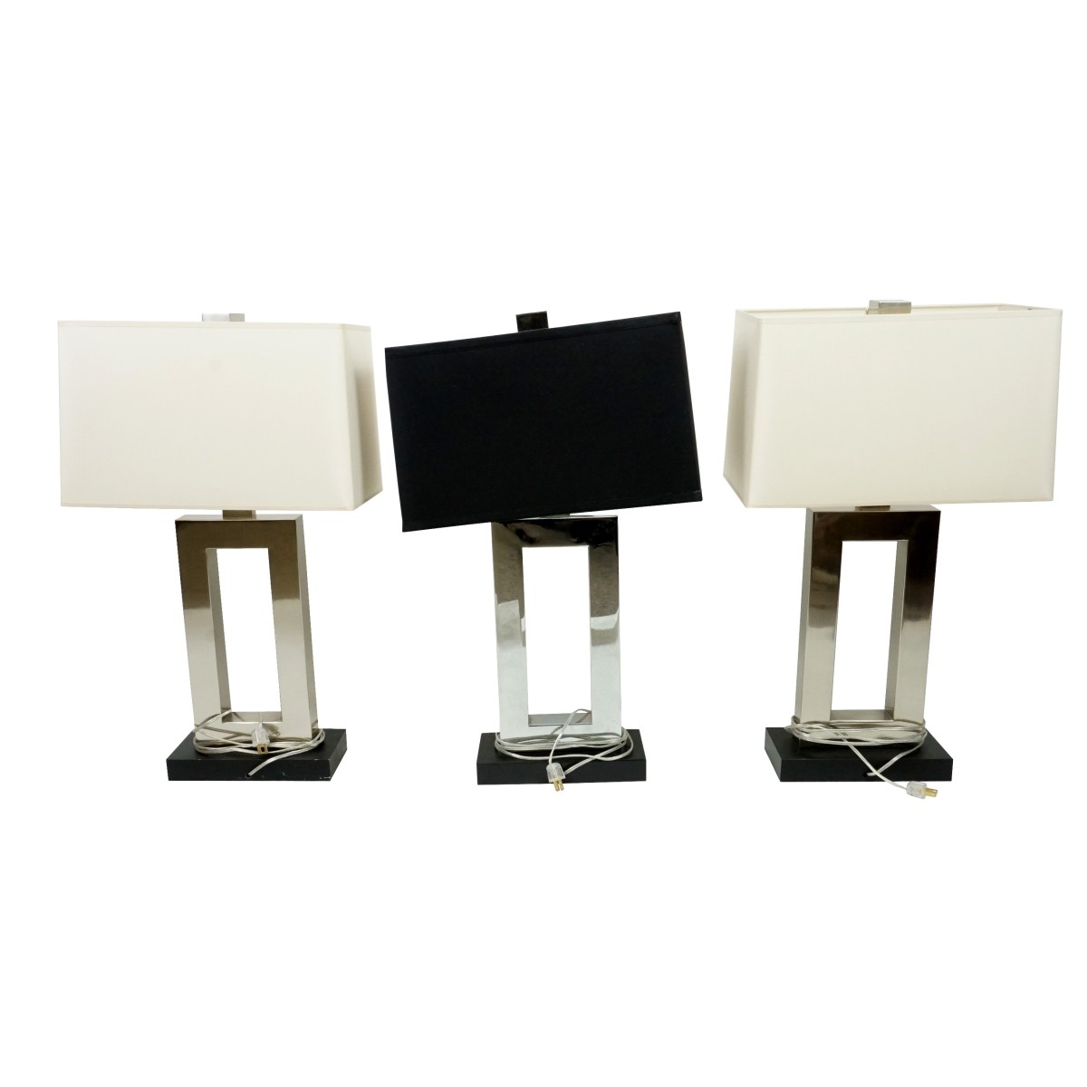 Set of Three Mid Century Modern Chrome Lamps with Shades. Lamps overall measures 30-5/8" x 11" x 5". Shades measure 11" x 18" x 9". Condition: Good conditon. Estimate: $100.00 - $200.00 Domestic Shipping: Third party
