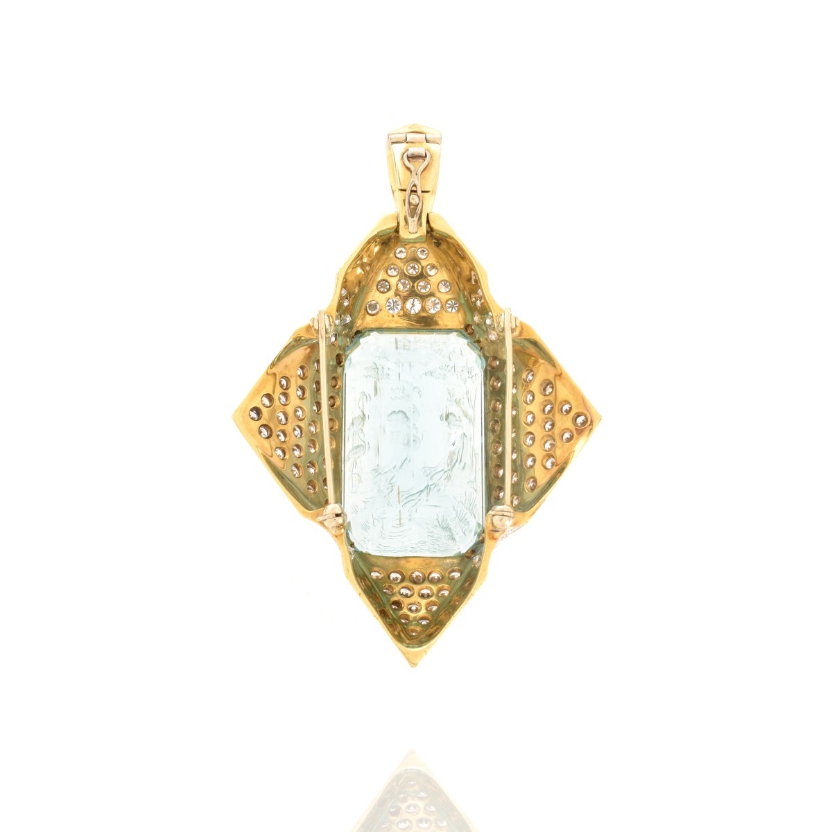 Vintage Approx. 70.0 Carved Carved Emerald Cut Aquamarine, 10.0 Carat TW One Hundred Twenty Eight Round Brilliant Cut Diamond and 18 Karat Yellow Gold Pendant / Brooch. Aquamarine with vivid color, measures 31 x 20mm. Diamonds E-F color, VVS-VS clarity. Measures 2-7/8" L, 1-7/8" W. Approx. weight: 55.73 grams. Condition: Very good vintage condition. For additional information and/or WhatsApp video please contact our resident GIA Graduate Gemologist, Russ Kodner at 954.650.5030 Estimate: $14,000.00 - $18,000.00 Domestic Shipping: $32.00