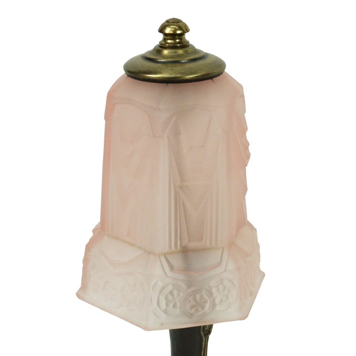 Pair of Art Deco Bronzed Metal Lamps with Pink Shade. Unsigned. Measures 14-5/8", base is 4-3/4" W, shade measures 5-1/4" x 4-1/2". Condition: Small area of oxidation to the base otherwise good condition. Estimate: $50.00 - $100.00 Domestic Shipping: Third party