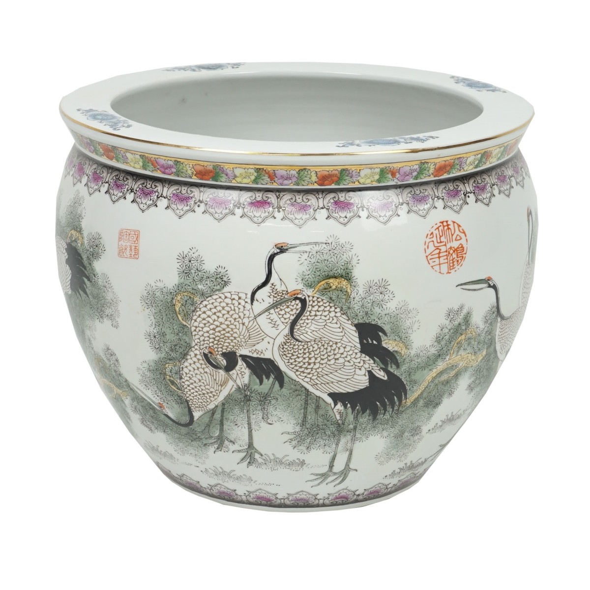 Modern Chinese Porcelain Garden Pot with Cranes and Seal Marks. Measures 12-3/4" x 16". Condition: Good condition. Estimate: $50.00 - $100.00 Domestic Shipping: Third party