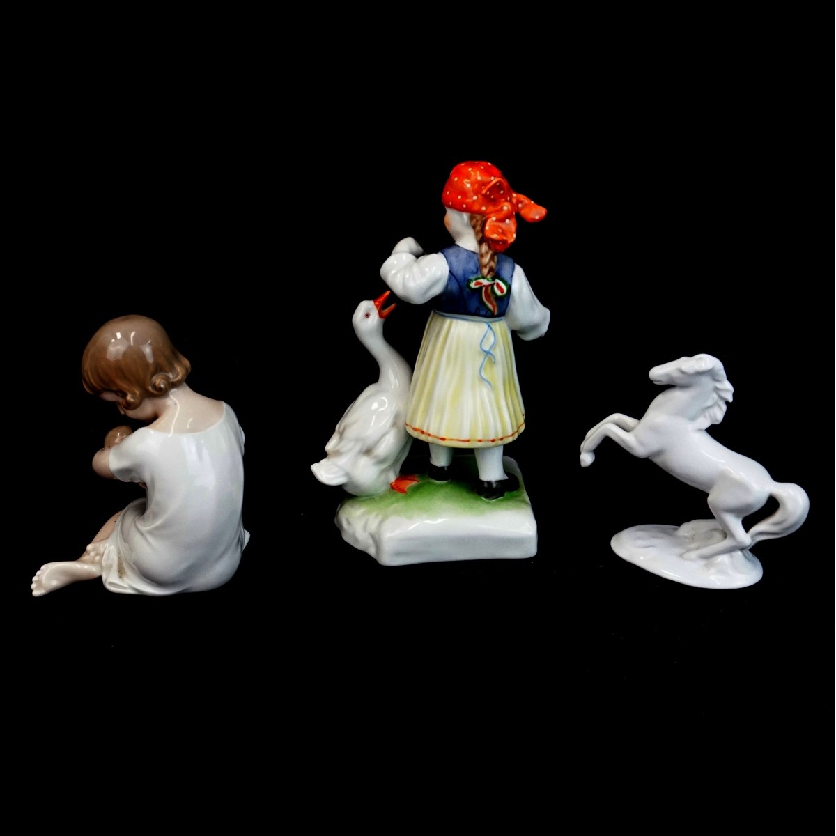 Lot of Three Vintage Porcelain Figurines. Includes: Herend "Girl Feeding Duck", Royal Copenhagen "Girl with Baby", and Austrian blanc de chine horse. Each appropriately signed. Herend measures 7-3/4" x 4-1/4" x 3". Royal Copenhagen measures 5" x 4-1/2" x 3". Condition: Each in good condition. Estimate: $100.00 - $300.00 Domestic Shipping: $55.00