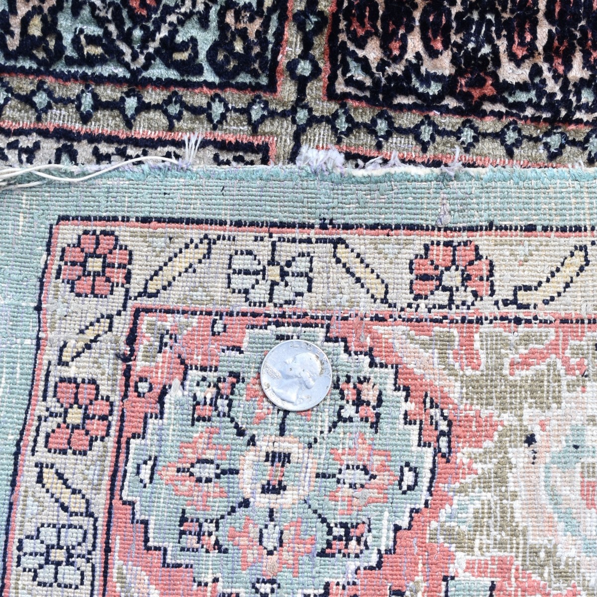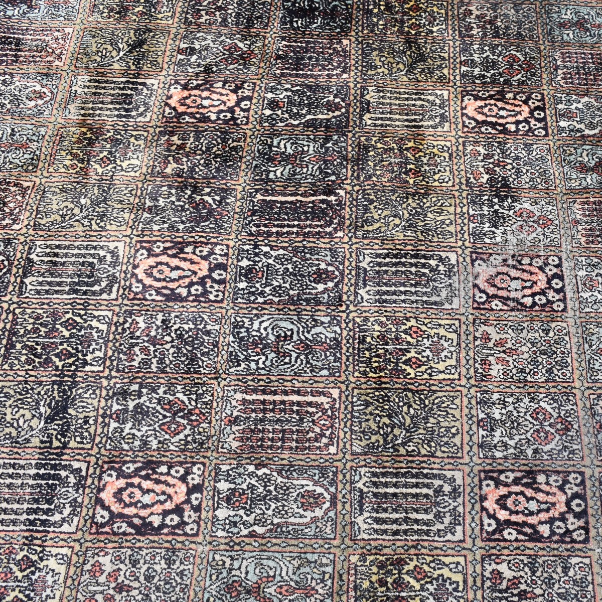 Vintage Persian Hamadan Style Kashmir Silk Rug. Intricate patterns on center with floral geometric design on the border. Label attached on the reverse side. Measures 124" x 92". Condition: Possible stain off center, sun fading or rubbing to a few areas, dirty otherwise good condition. Estimate: $100.00 - $300.00 Domestic Shipping: Third party