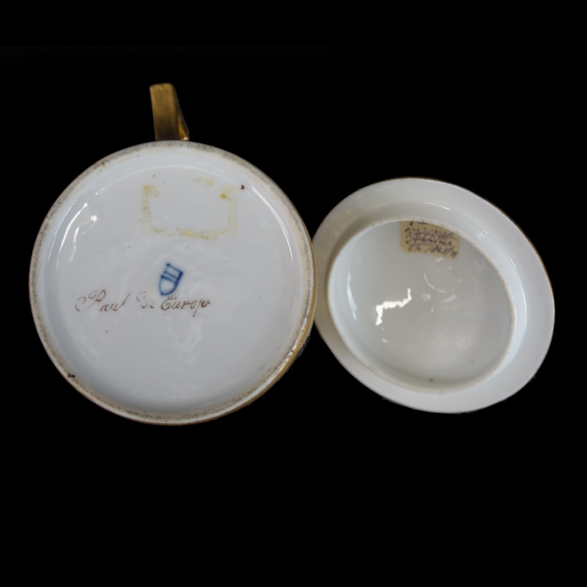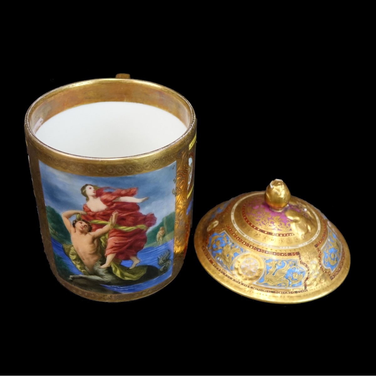 19th Century Royal Vienna Ornate Lidded Cup with Mythological Portrait. Signed with blue beehive mark to the base. Continuous foliage scroll detail on the surface. Measures 5" x 4" (w/lid plus handle), Measures 3-1/4" (w/o lid). Condition: Rubbing to the gilding otherwise good condition. Estimate: $100.00 - $500.00 Domestic Shipping: $48.00