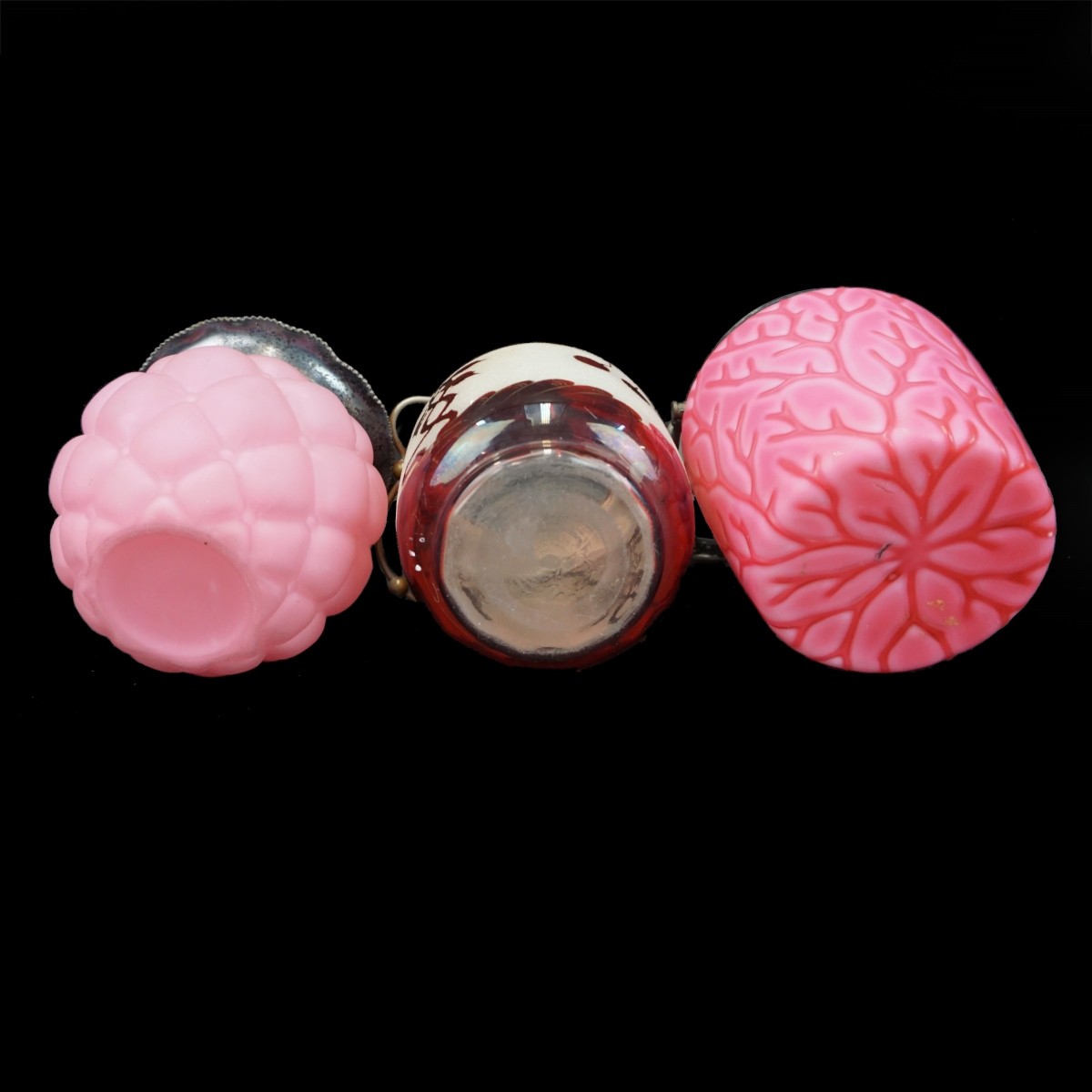 Grouping of Three (3) Vintage Victorian Style Glass Covered Jars. Unsigned. Tallest measures 9" x 6" x 6" (w/o handle). Smallest measures 8-1/2" x 6-1/2" x 5-3/4". Condition: Good condition. Wear and rubbing ot the metal hardware. Estimate: $100.00 - $300.00 Domestic Shipping: $88.00