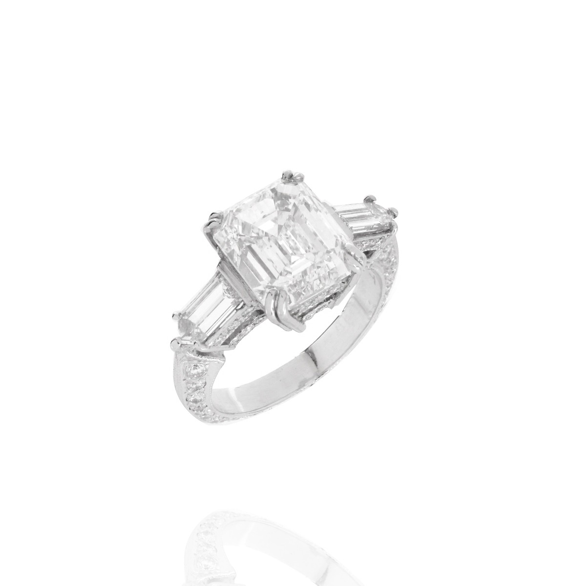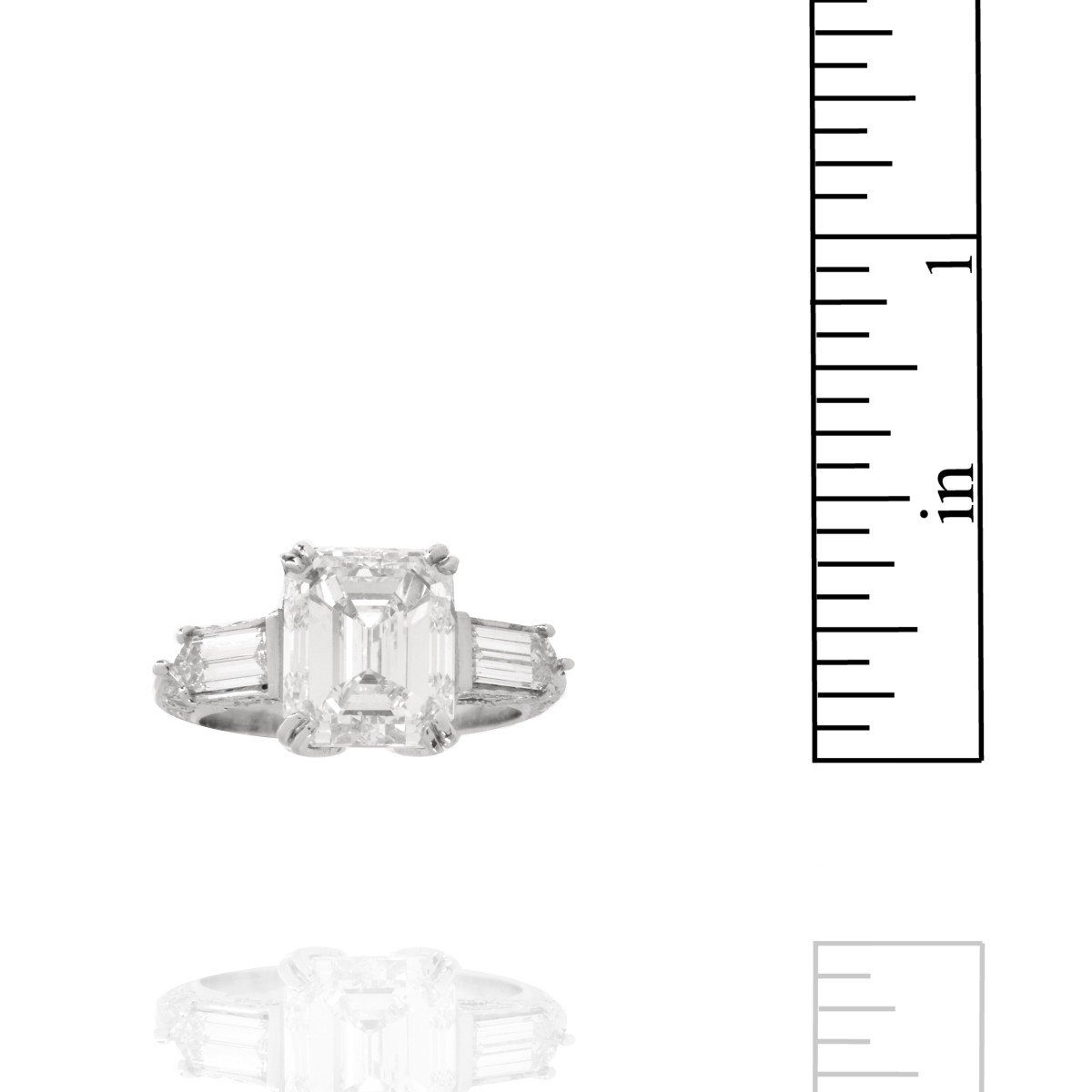 GIA Certified 5.02 Carat Emerald Cut Diamond and Platinum Engagement Ring. Diamond G color, VS2 clarity. Accented with 2.20 carat TW baguette and round brilliant cut diamonds, D-E color, VVS-VS clarity. Signed Plat. Ring size 6. Approx. weight: 7.45 grams. GIA Report 6372776628 dated 3/10/2021 to accompany this Lot. Condition: Very good condition. Please refer to GIA report for further details. For additional information and/or WhatsApp video please contact our resident GIA Graduate Gemologist, Russ Kodner at 954.650.5030 Estimate: $90,000.00 - $120,000.00 Domestic Shipping: $34.00