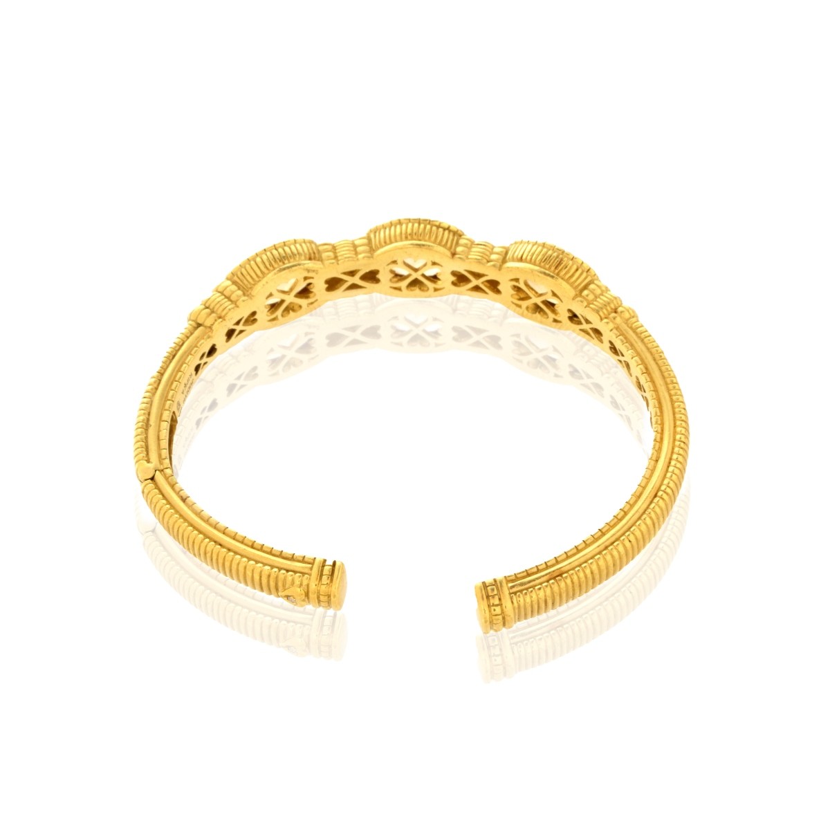 Judith Ripka Approx. 15.0 Carat TW Three Oval Cut Citrine, .20 Carat TW Round Brilliant Cut Diamond and 18 Karat Yellow Gold Hinged Cuff Bangle Bracelet. Citrines with vivid color. Signed, stamped 18K. Measures 5-1/2" L (plus 9/16" opening). Approx weight: 36.10 grams. Condition: Very good condition. Slightly out of round. For additional information and/or WhatsApp video please contact our resident GIA Graduate Gemologist, Russ Kodner at 954.650.5030 Estimate: $4000.00 - $6000.00 Domestic Shipping: $32.00