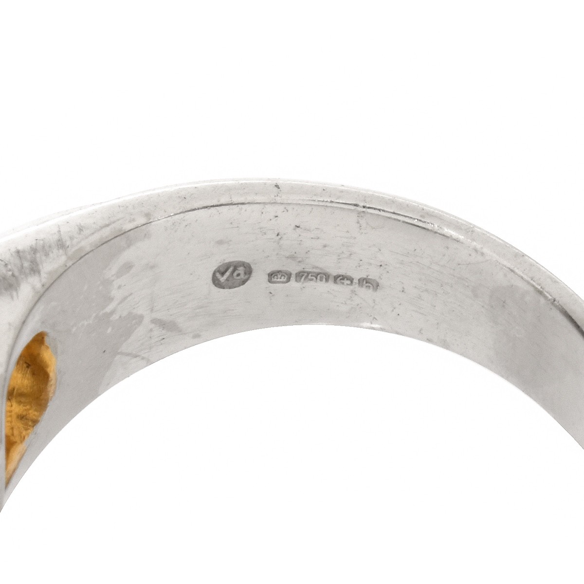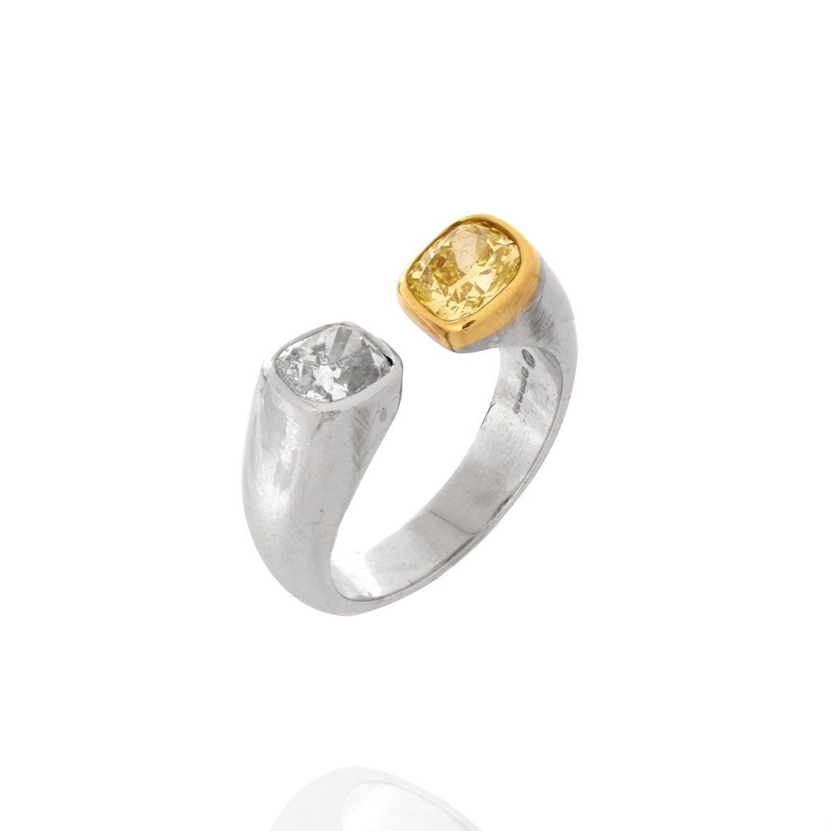 GIA Certified 1.00 Carat Cushion Brilliant Cut Diamond, D Color, VVS2 clarity and 1.01 Carat Cushion Brilliant Cut Natural Fancy Intense Yellow Diamond, VVS2 clarity and 18 Karat White Gold Ring. Stamped 750, British hallmarks. Ring size 7-1/2. Approx. weight: 12.55 grams. GIA Report 2105173974 to accompany this Lot. Condition: Very good pre-owned condition. For additional information and/or WhatsApp video please contact our resident GIA Graduate Gemologist, Russ Kodner at 954.650.5030 Estimate: $12,000.00 - $15,000.00 Domestic Shipping: $30.00