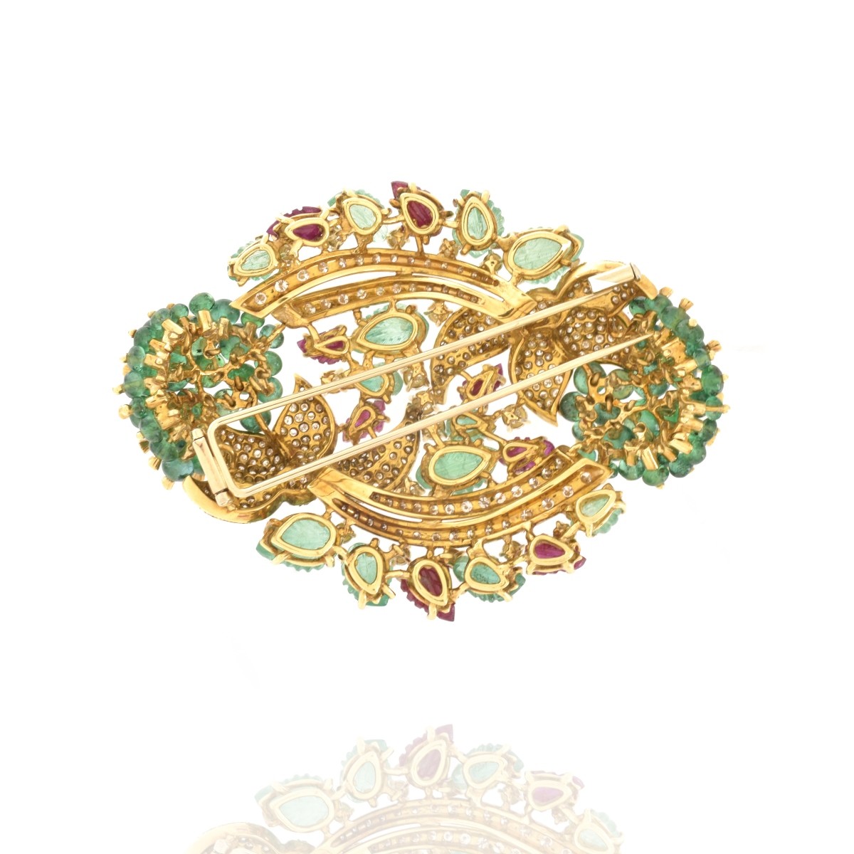 Large Vintage Giovane Italian Approx. 35.0 Carat TW Emerald, 16.0 Carat TW Ruby, 10.50 Carat Round Brilliant Cut Diamond and 18 Karat Yellow Gold Brooch. Gemstones with vivid color. Diamonds G-I color, VVS-VS clarity. Signed, stamped Italy, 18K, Italian hallmark. Measures 3-1/8" x 2-1/4". Approx. weight: 71.59 grams. Condition: Very good vintage condition. For additional information and/or WhatsApp video please contact our resident GIA Graduate Gemologist, Russ Kodner at 954.650.5030 Estimate: $18,000.00 - $25,000.00 Domestic Shipping: $32.00