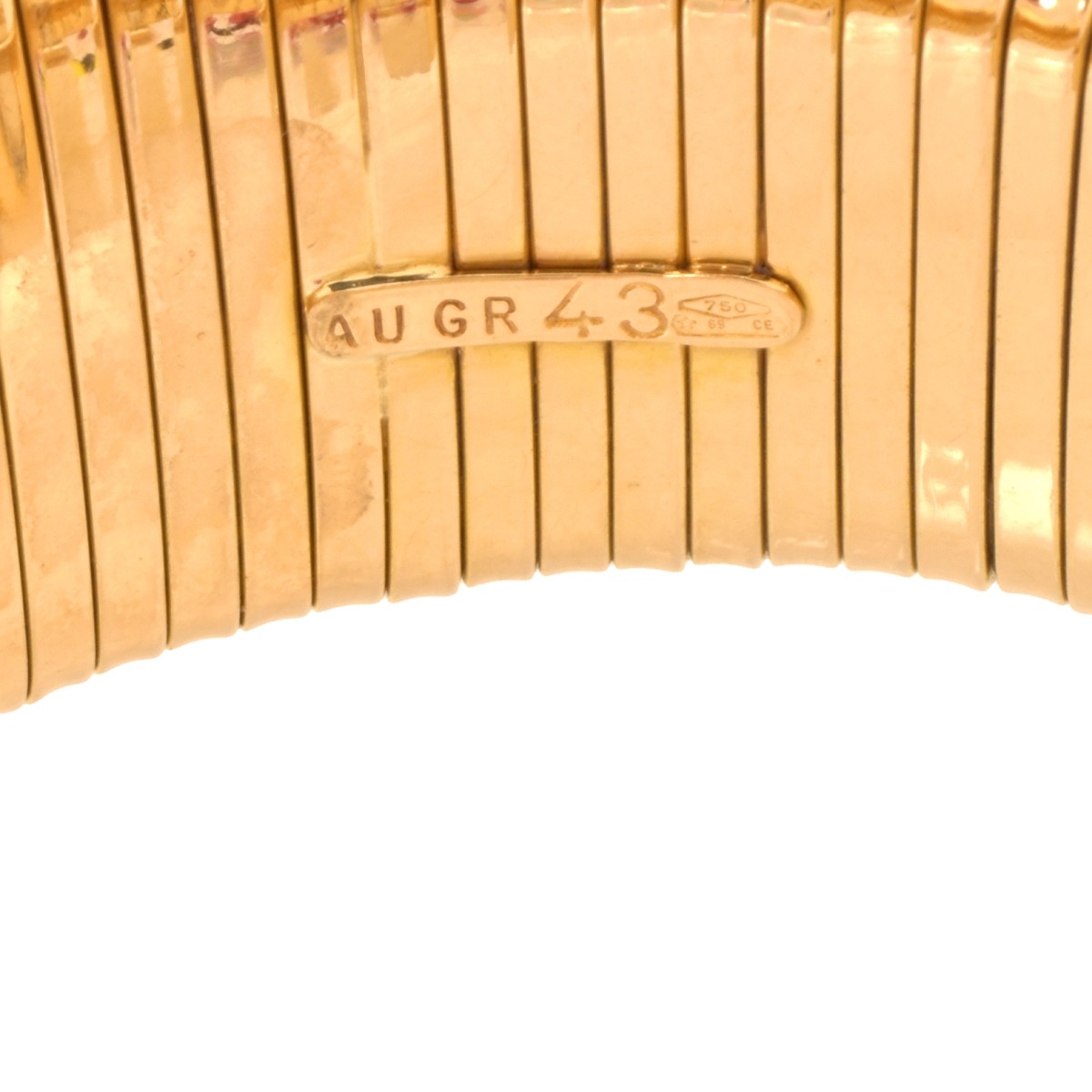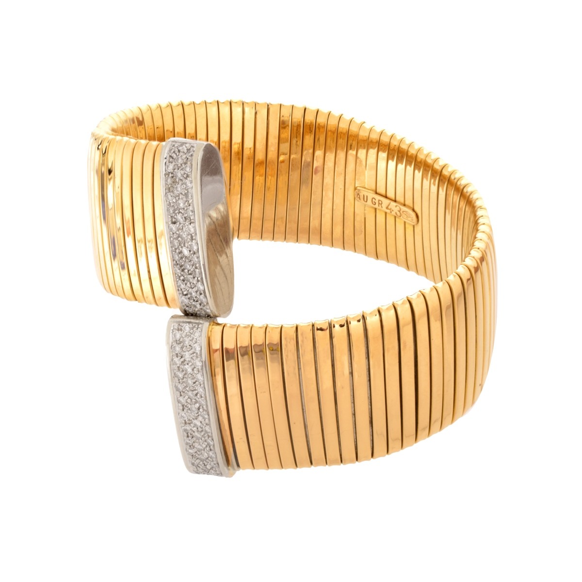 Vintage Italian Round Brilliant Cut Diamond and 18 Karat Yellow Gold Flexible Cuff Bangle Bracelet. Diamonds E-F color, VS1-VS2 clarity. Stamped 750, Italian hallmark. Measures 6-1/2" L, 1" W. Approx. weight: 60.64 grams. Condition: Very good condition. For additional information and/or WhatsApp video please contact our resident GIA Graduate Gemologist, Russ Kodner at 954.650.5030 Estimate: $6000.00 - $9000.00 Domestic Shipping: $34.00