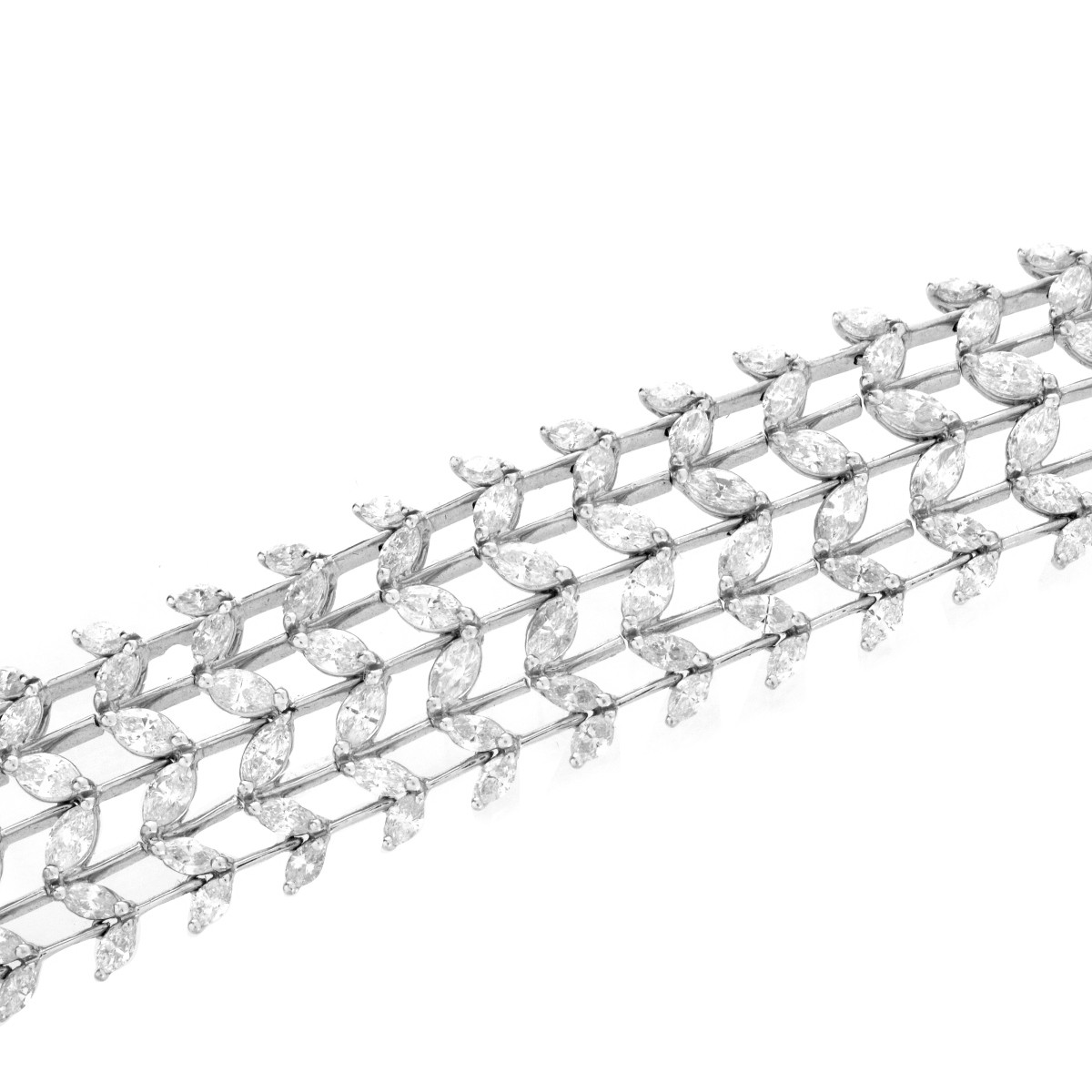 Vintage Approx. 15.0 Carat TW Marquise Cut Diamond and 18 Karat White Gold Bracelet. Diamonds E-F color, VS1-VS2 clarity with a few SI1. Measures 7" L, 3/4" W. Approx. weight: 42.87 grams. Condition: Very good vintage condition. For additional information and/or WhatsApp video please contact our resident GIA Graduate Gemologist, Russ Kodner at 954.650.5030 Estimate: $9000.00 - $12,000.00 Domestic Shipping: $32.00
