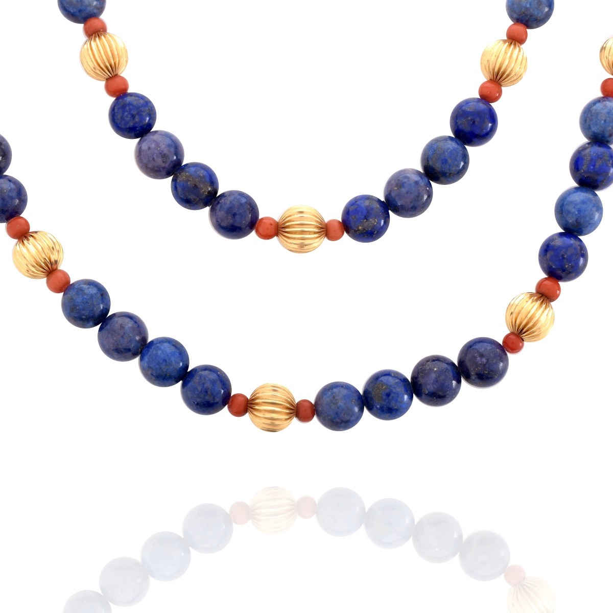 Vintage Lapis Lazuli Bead, Red Coral Bead and 14 Karat Yellow Gold Bead Necklace. Lapis beads measure 10mm, 14K beads measure 9.5mm. Necklace measures 40" L. Approx. weight: 125.18 grams. Condition: Very good vintage condition. Estimate: $400.00 - $600.00 Domestic Shipping: $36.00