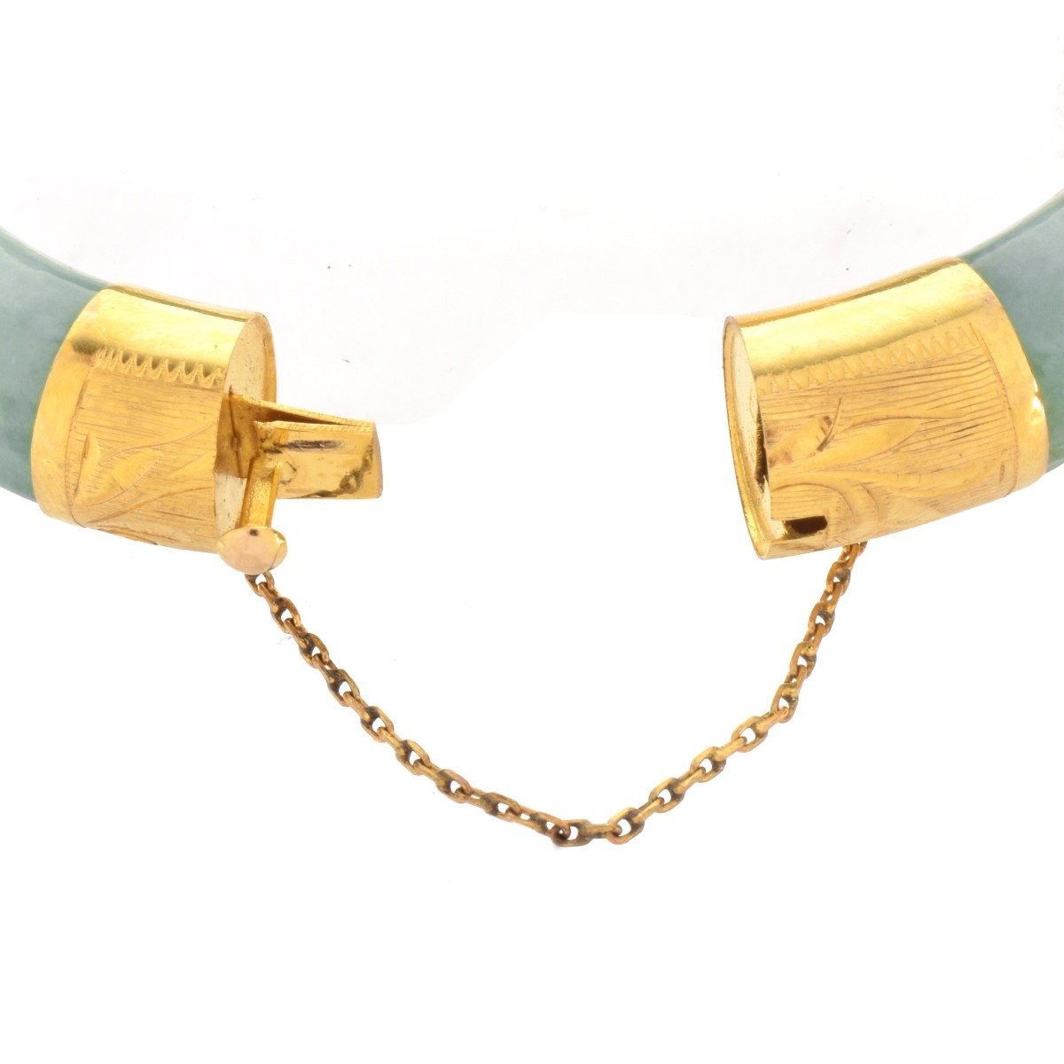 Vintage Carved Celadon Jade and 14 Karat Yellow Gold Hinged Bangle Bracelet. Stamped 14K 585 to clasp. Measures 7" L, 7/16" W. Approx. weight: 72.97 grams. Condition: Very good condition. Estimate: $400.00 - $800.00 Domestic Shipping: $32.00
