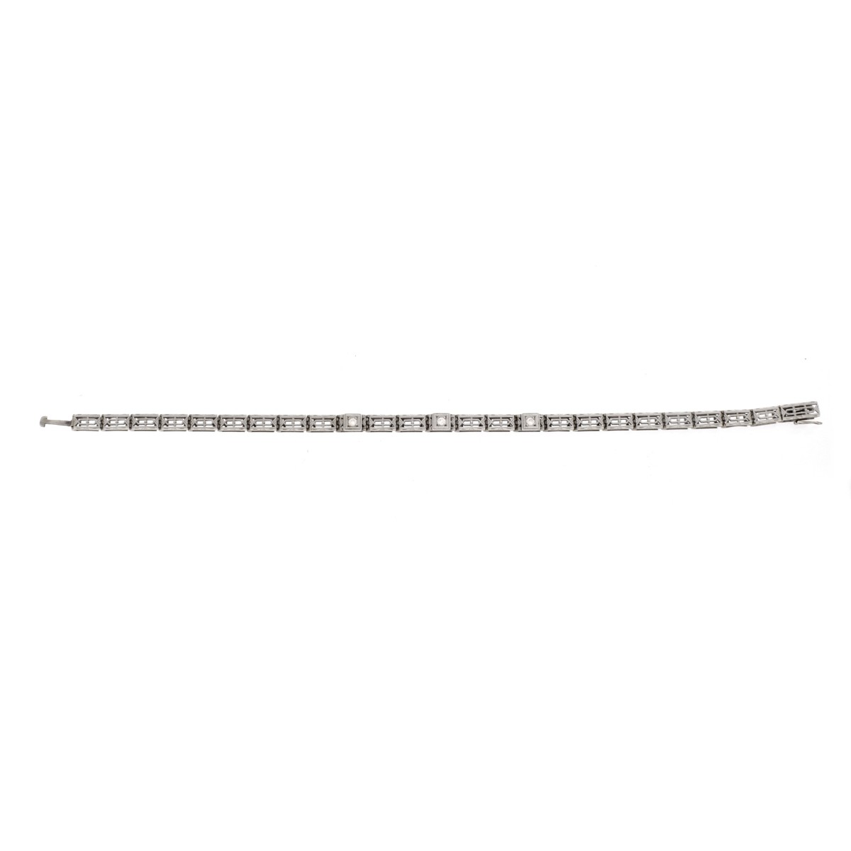 Art Deco Old European Cut Diamond, Platinum and 14 Karat Yellow Gold Bracelet. Stamped 14K. Measures 7-3/4" L, 3/16" W. Approx. weight: 11.68 grams. Condition: Antique condition. Needs cleaning. Estimate: $300.00 - $500.00 Domestic Shipping: $30.00