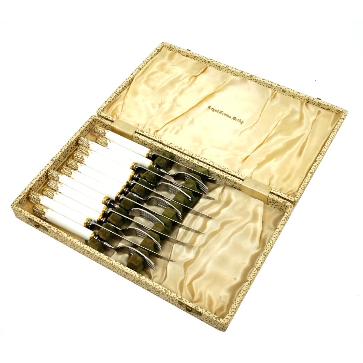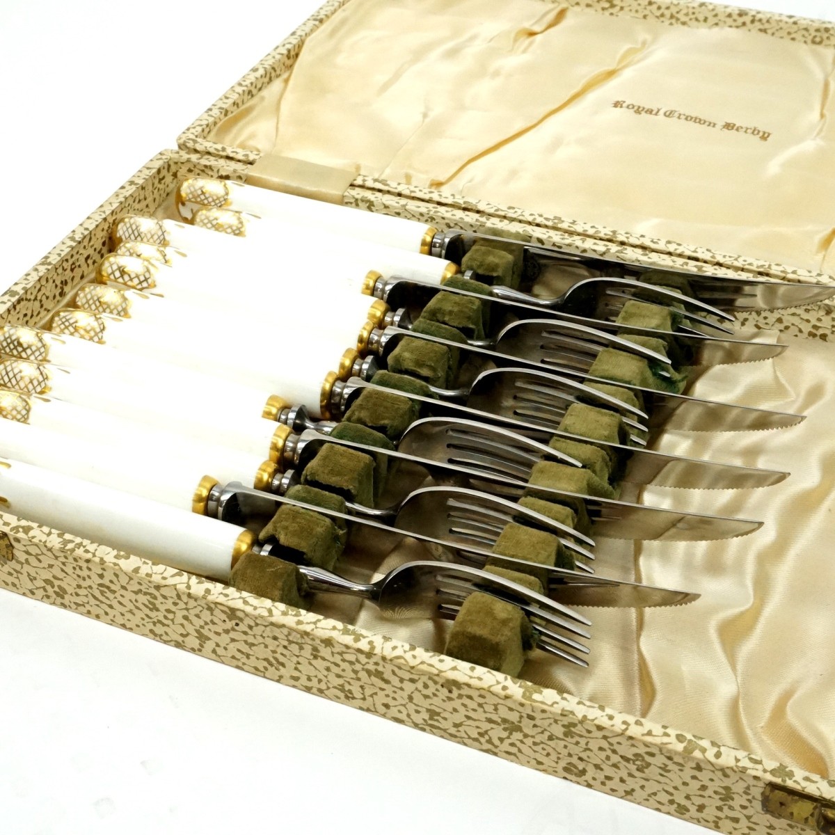 Set of Twelve Royal Crown Derby Knife and Fork Set in Original Box. Includes 6 forks and 6 knives. Forks measures 7". Knives measures 8-5/8". Box measures 1-5/8" x 12-1/8" x 7-1/4". Condition: Good condition. Estimate: $50.00 - $150.00 Domestic Shipping: $62.00
