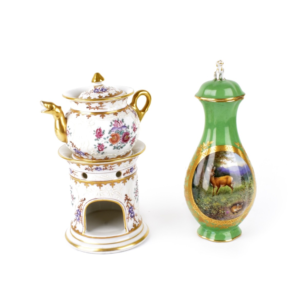Grouping of Two (2) Vintage Porcelain Tableware. Includes a teapot / warmer together with a French covered vase with Sevres style mark. Teapot combo measures 9" H (all together), teapot measures 5-1/4" x 5-3/4", base measures 5" x 4-1/2". Vase measures 9-3/8" (w/cover) x 3-1/2" x 3-1/4". Condition: Teapot has a chip to the rim and a chip on the base of the cover otherwise good condition. Estimate: $50.00 - $100.00 Domestic Shipping: $72.00